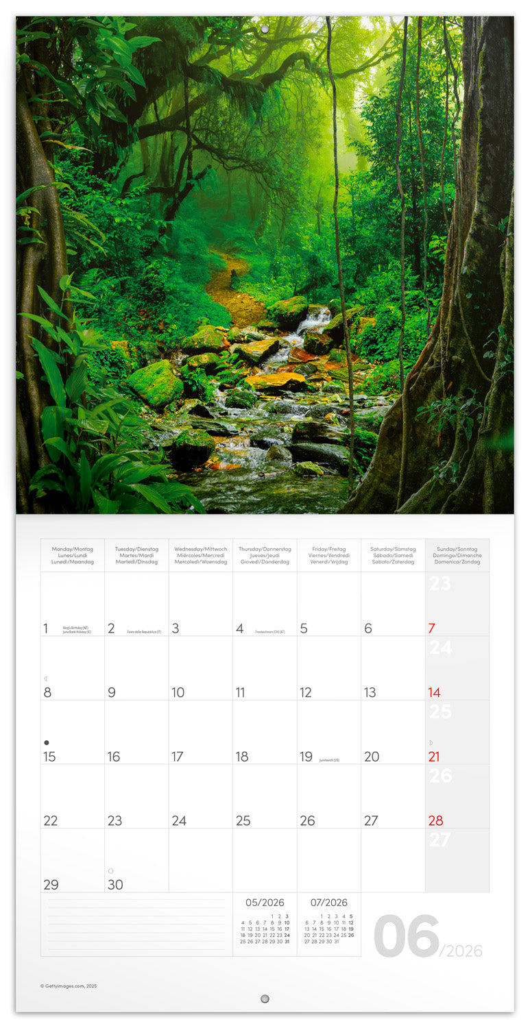 Zwölf wunderschöne Fotografien, die die Schönheit der Regenwälder einfangen. Der Kalender enthält ein übersichtliches Kalendarium von September 2025 bis Dezember 2026 in sechs Sprachen, Mondphasen, wichtige Feiertage und Platz für tägliche Notizen.
