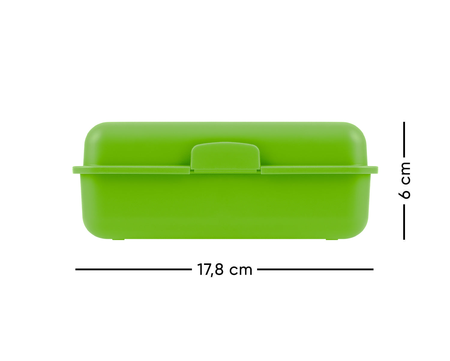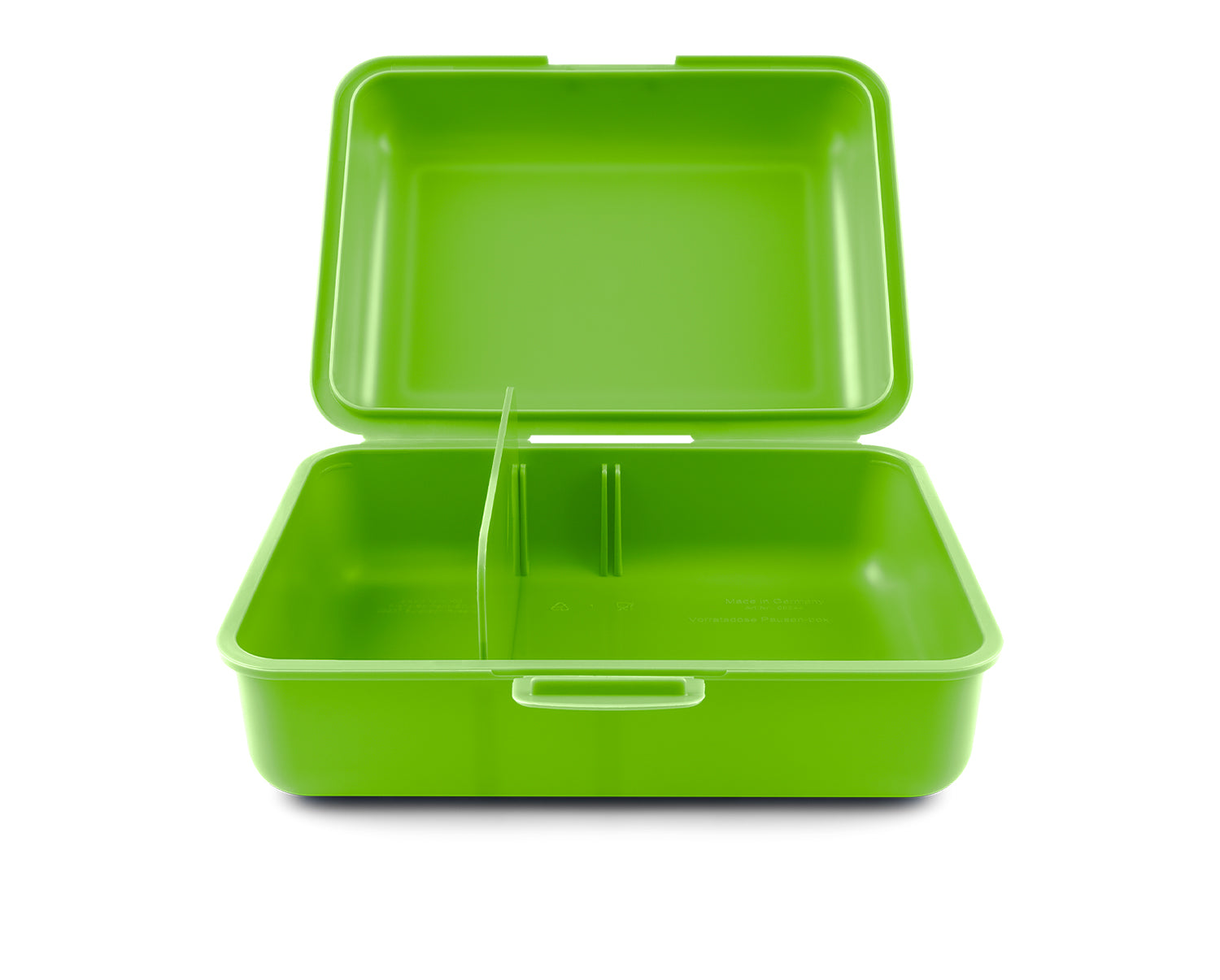 • Snackbox aus Kunststoff mit innerer Trennwand.