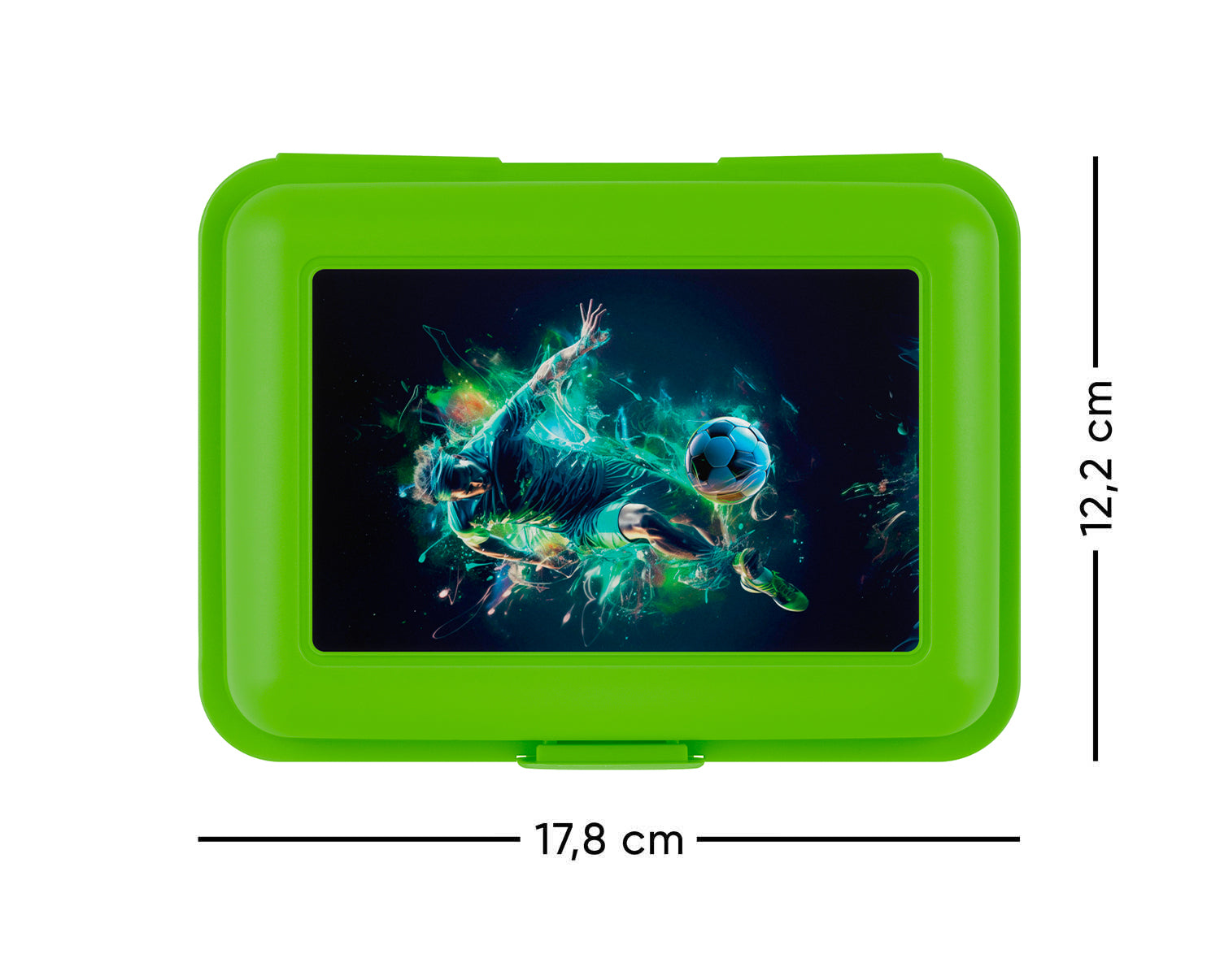 Kunststoff-Brotdose mit Fußballspieler-Motiv und verstellbarer Trennwand für eine bunte und ausgewogene Mahlzeit.