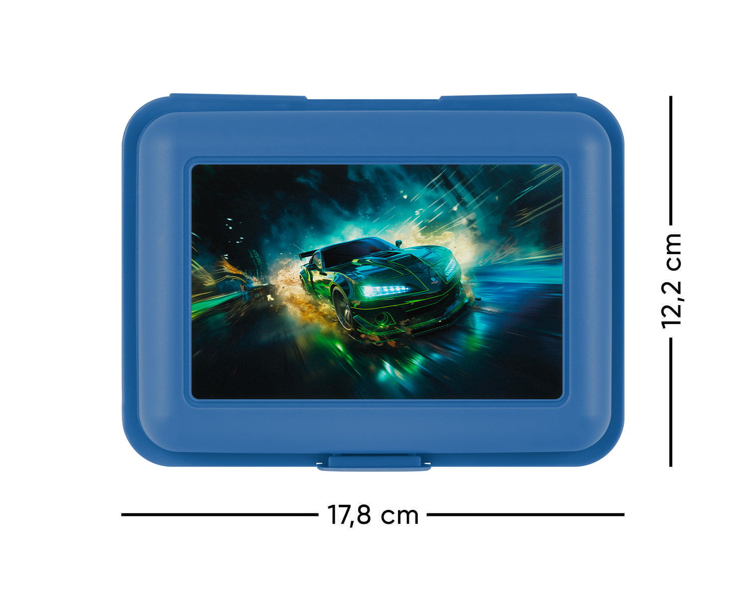 Praktische Brotdose mit Rennauto-Motiv und verstellbarer Trennwand zum Trennen der einzelnen Lebensmittel.