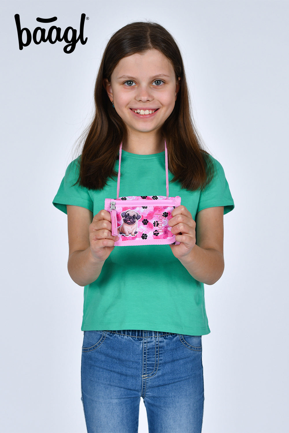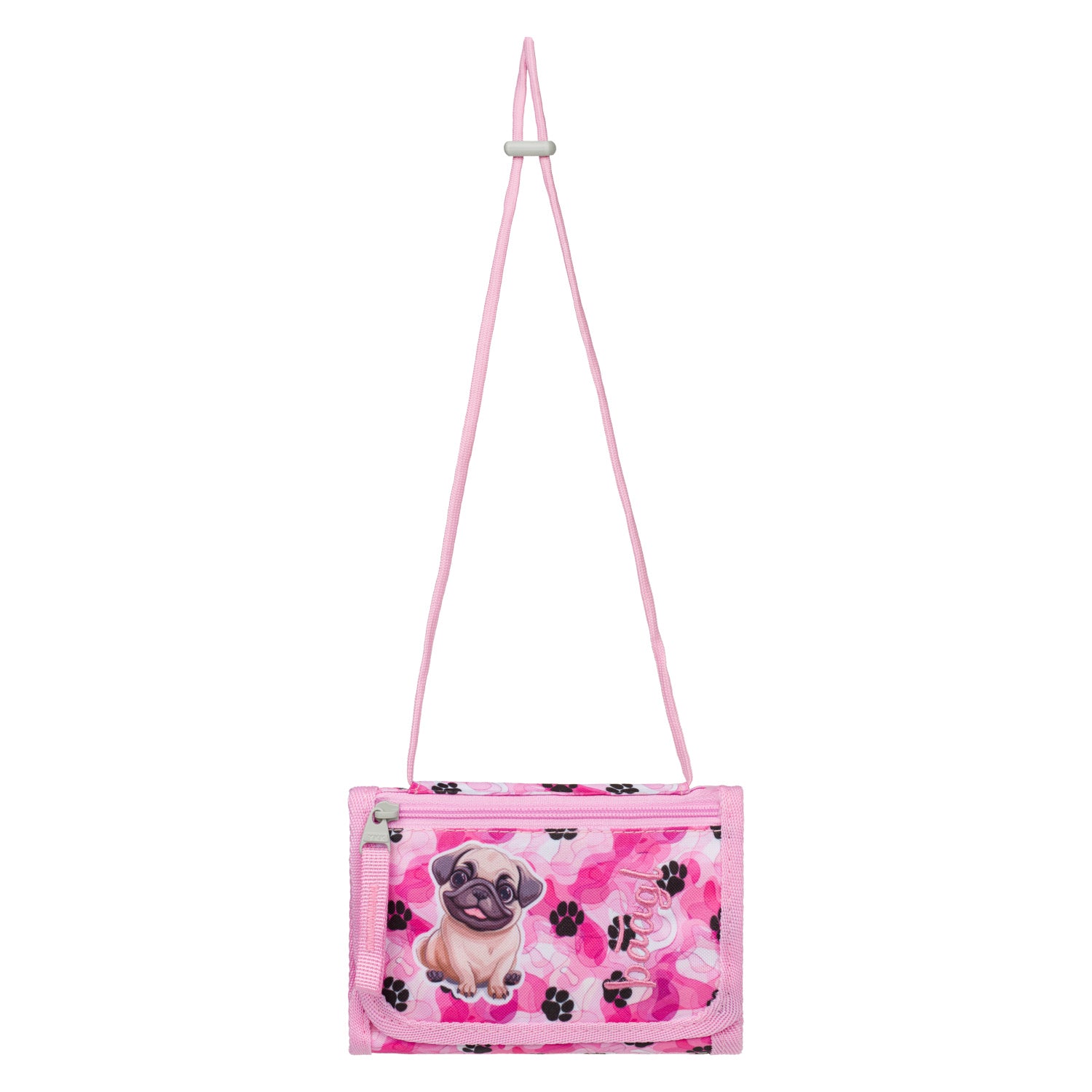 Rosa Geldbörse mit Bulldoggen-Motiv – sicherer Stauraum für Kleingeld, Mensa-Chip oder Spindschlüssel.