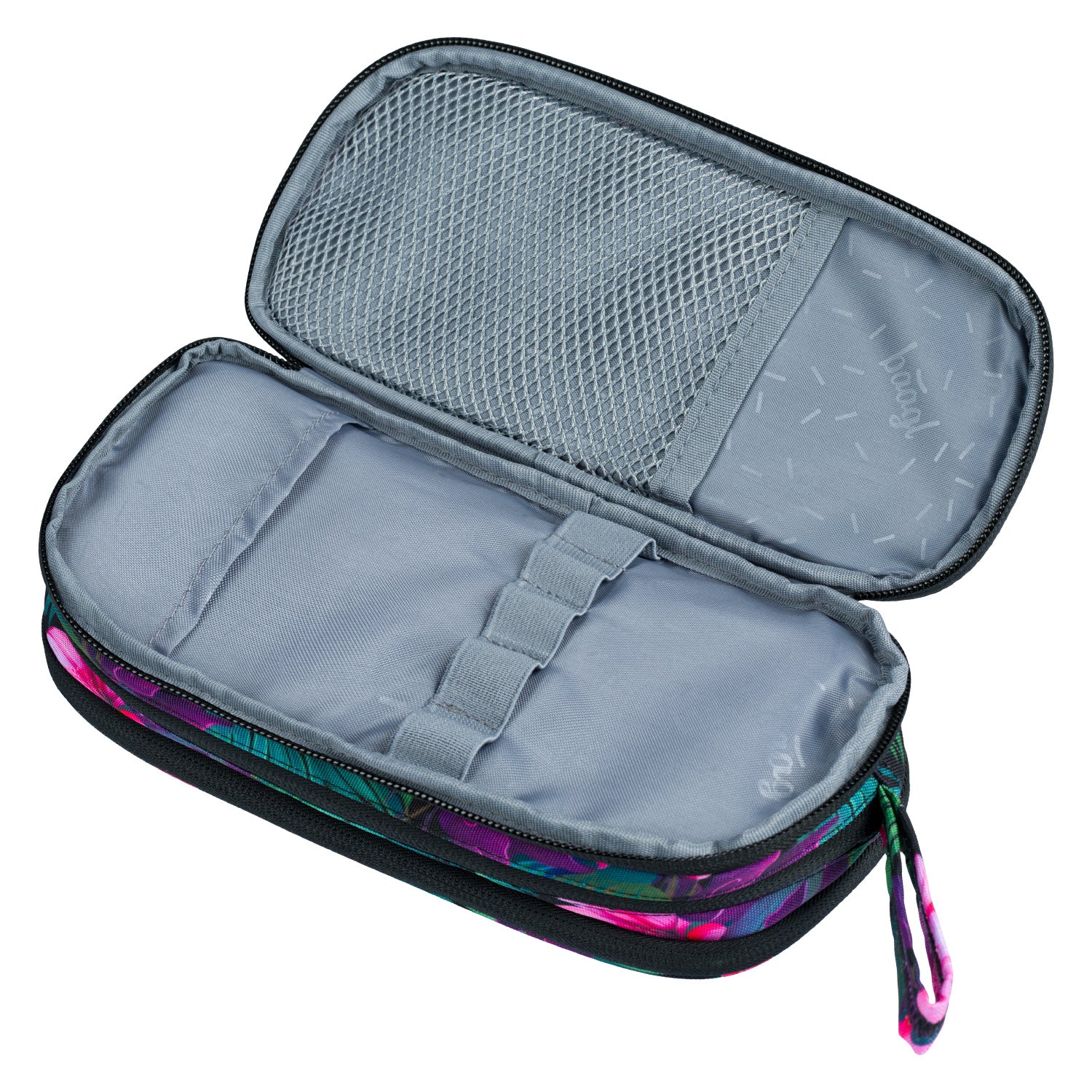 Günstiges Schulset bestehend aus einem farbenfrohen Coolmate-Rucksack, einem Federmäppchen und einem praktischen Turnbeutel mit tropischem Blumenmotiv und BAAGL-Logo.