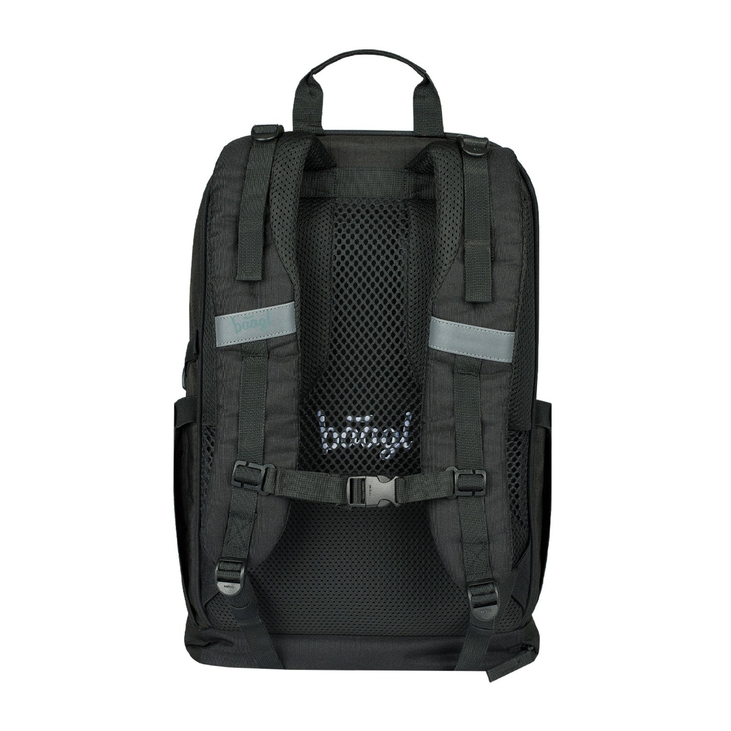 Dreiteiliges Set mit schwarzem ergonomischem Schulrucksack Cubic Uni mit unauffälligem BAAGL-Logo, Schüler-Federmäppchen-Etui und Turnbeutel – die ideale Wahl für Schüler ab der 3. Klasse.