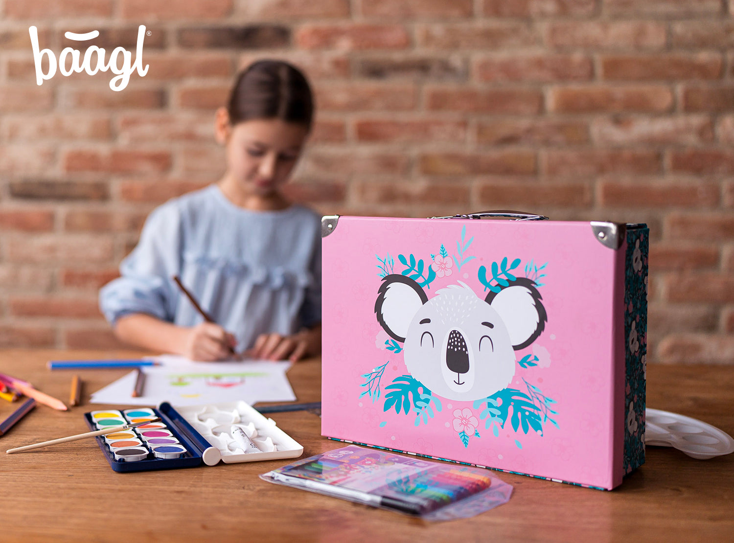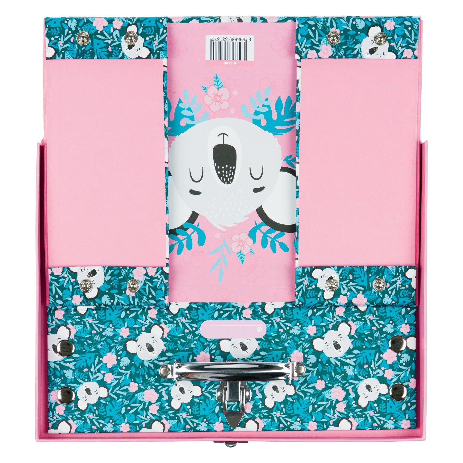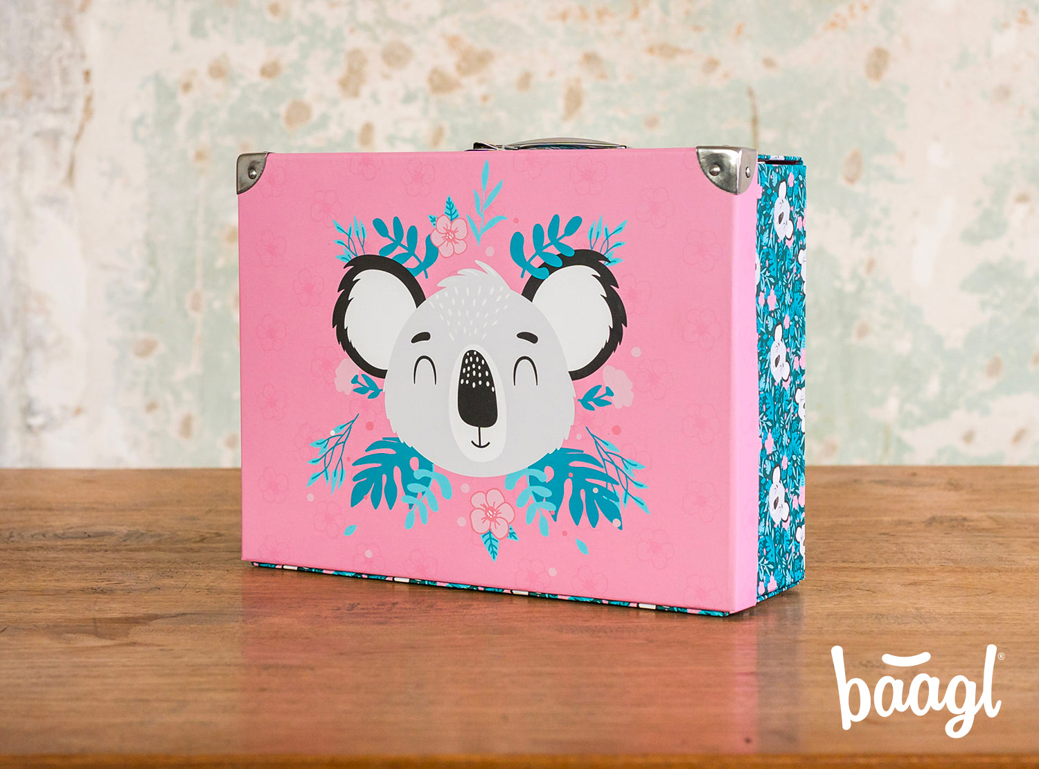 Papierkoffer mit Koala-Motiv zur sicheren Aufbewahrung von Schreib- oder Bastelutensilien. Einfaches Faltsystem mit Druckknöpfen.