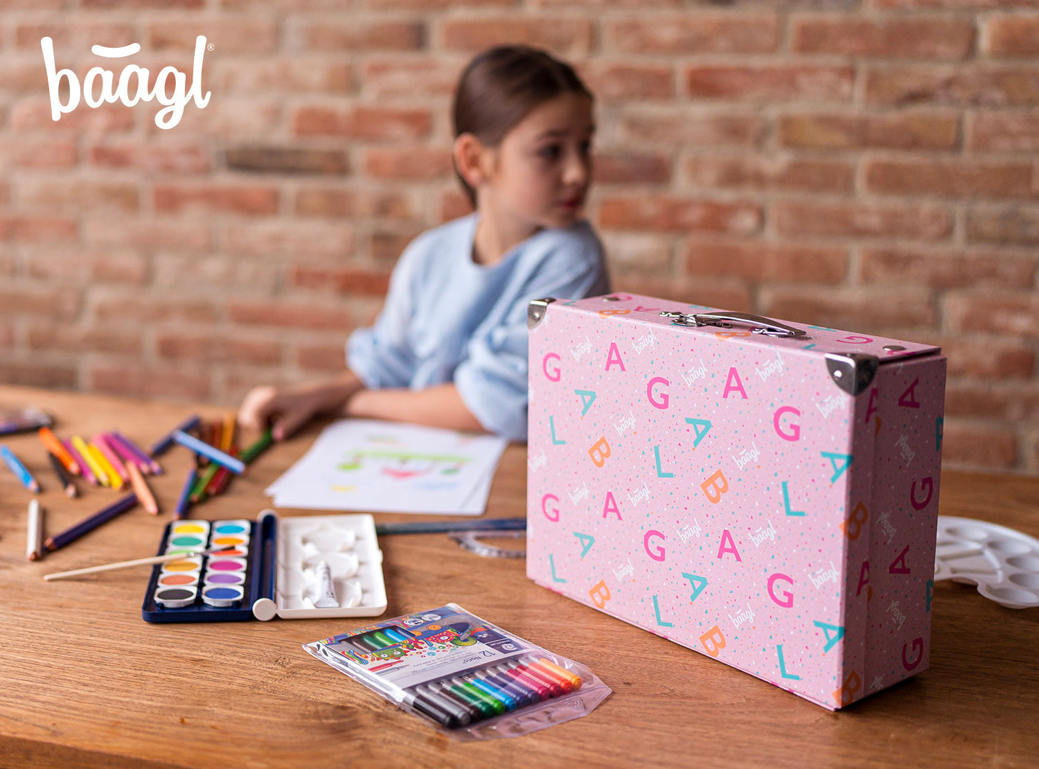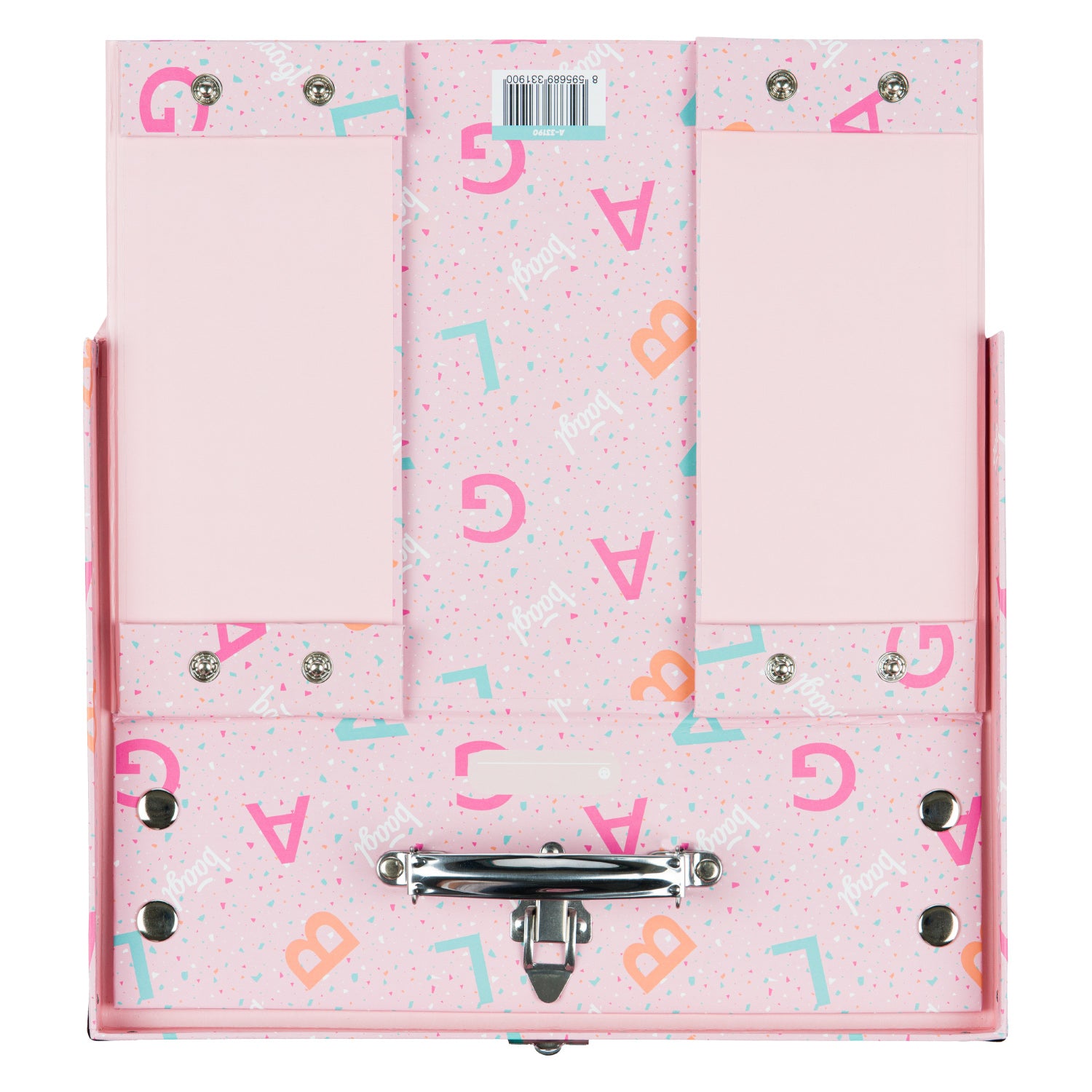 Papierkoffer mit rosafarbenem Baagl-Logo zur sicheren Aufbewahrung von Bastel- oder Schreibutensilien. Einfaches Faltsystem mit Druckknöpfen.