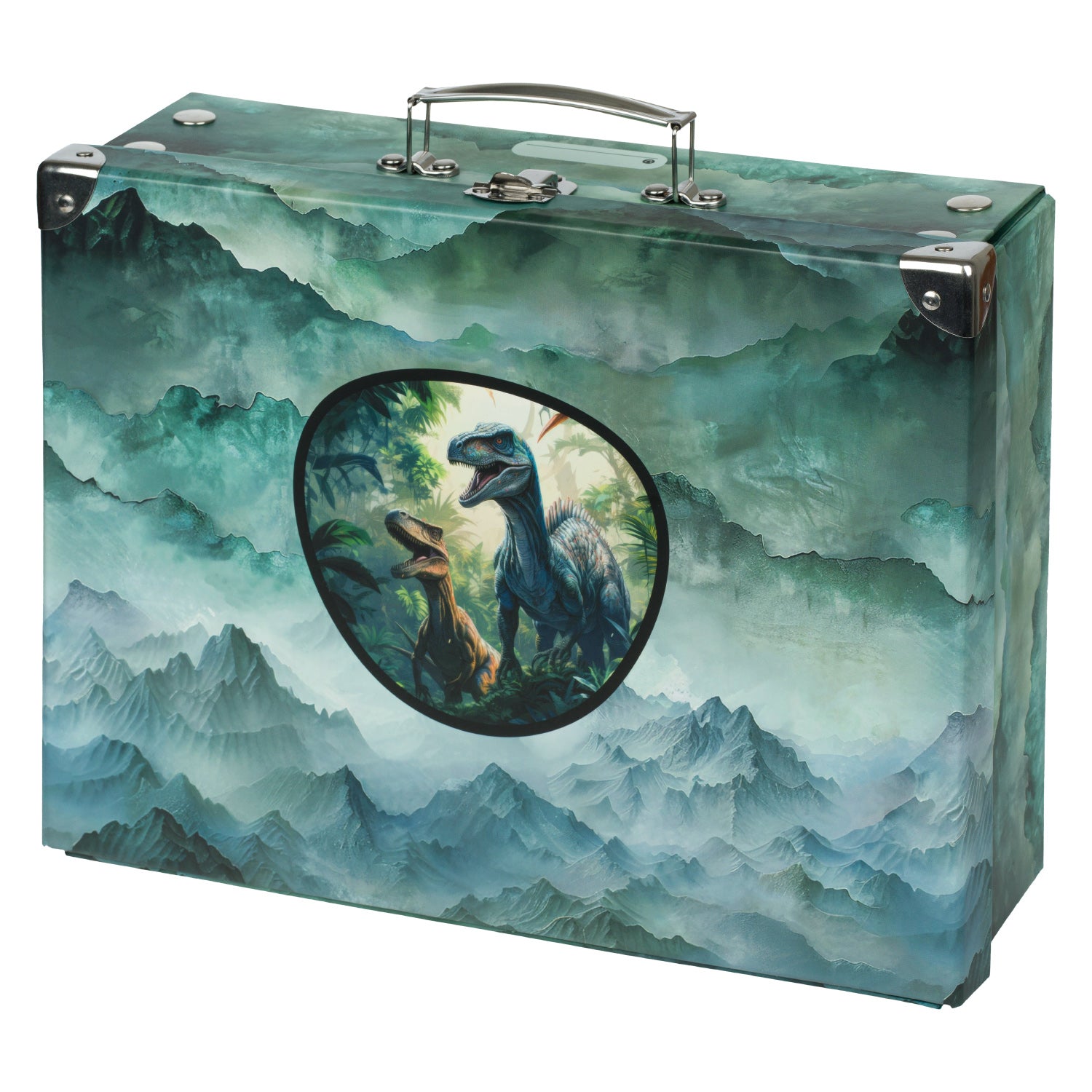 Faltbarer Schul-Koffer mit Dinosaurier-Motiv zur Aufbewahrung von Kunstmaterialien, Spielzeug und anderen Kleinigkeiten.