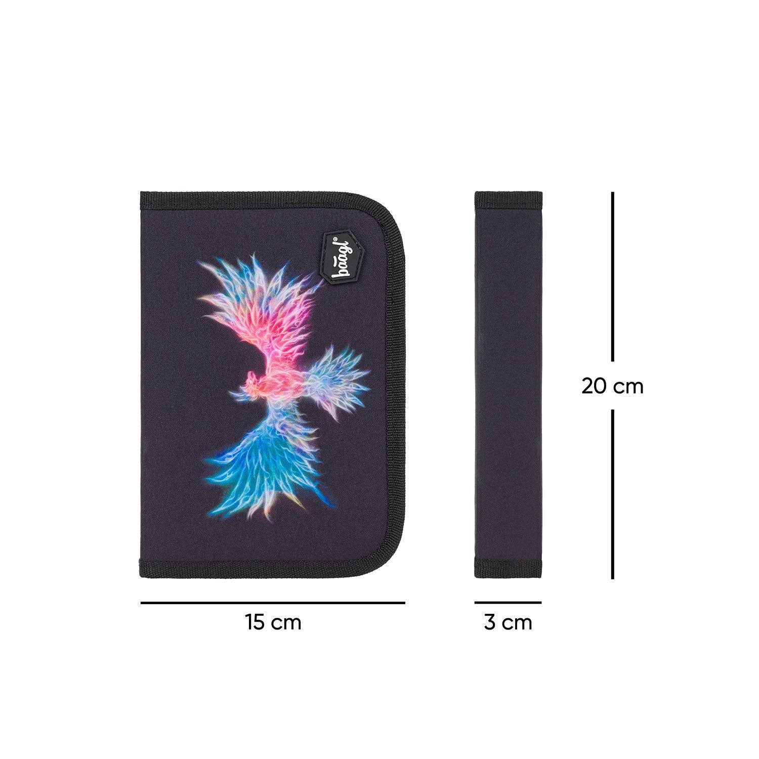 Klassisches schwarzes Federmäppchen mit dem Motiv des mythischen Phönix-Vogels.