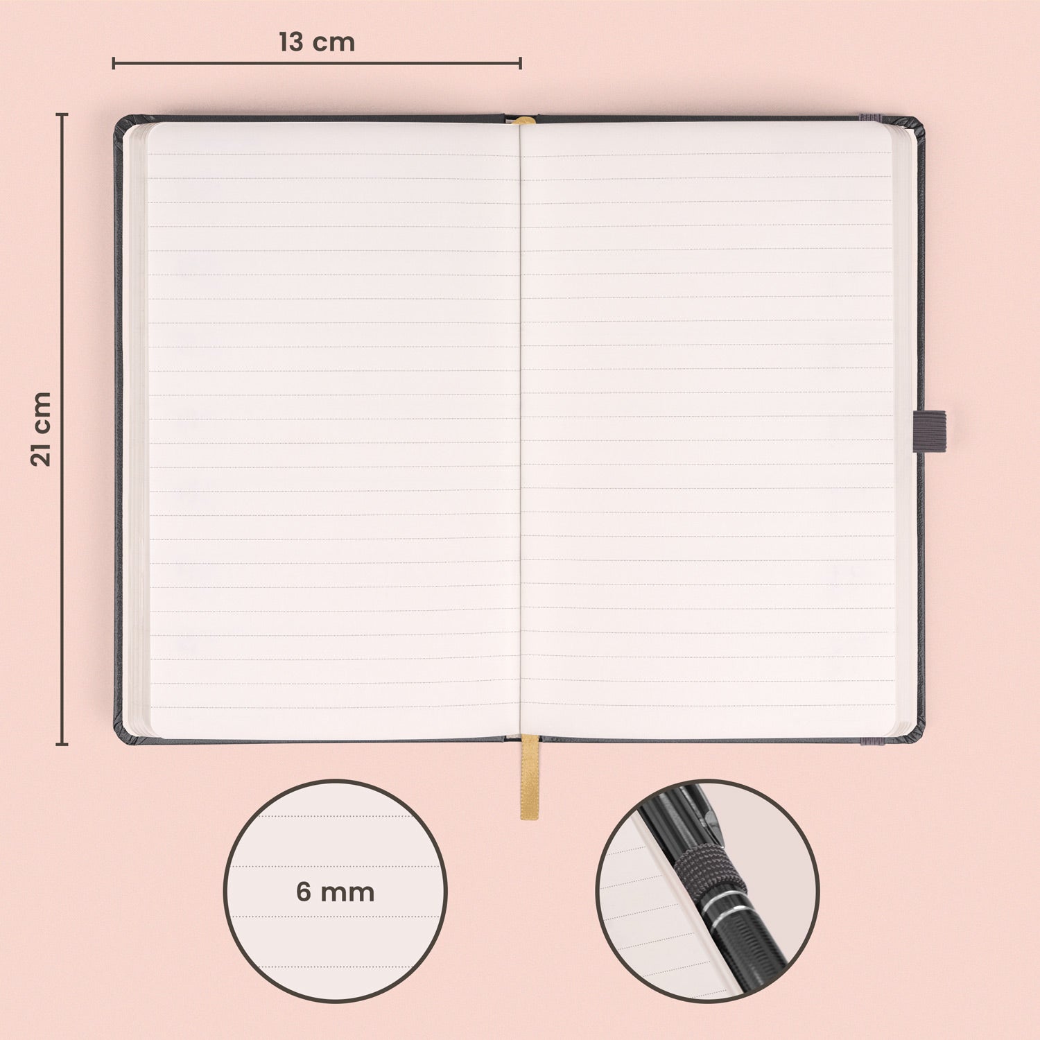 Das praktische leichte linierte Notizbuch in klasischem Grau mit fein strukturierter Oberfläche, auf die Sie Ihr Firmenlogo prägen lassen können. Das Notizbuch hat einen stabilen Bucheinband, abgerundete Ecken, eine Stiftschlaufe, ein Gummiband und ein Stofflesezeichen. Die Linien haben 6 mm Abstand und sind auf hochwertigem gelblichem Papier gedruckt.