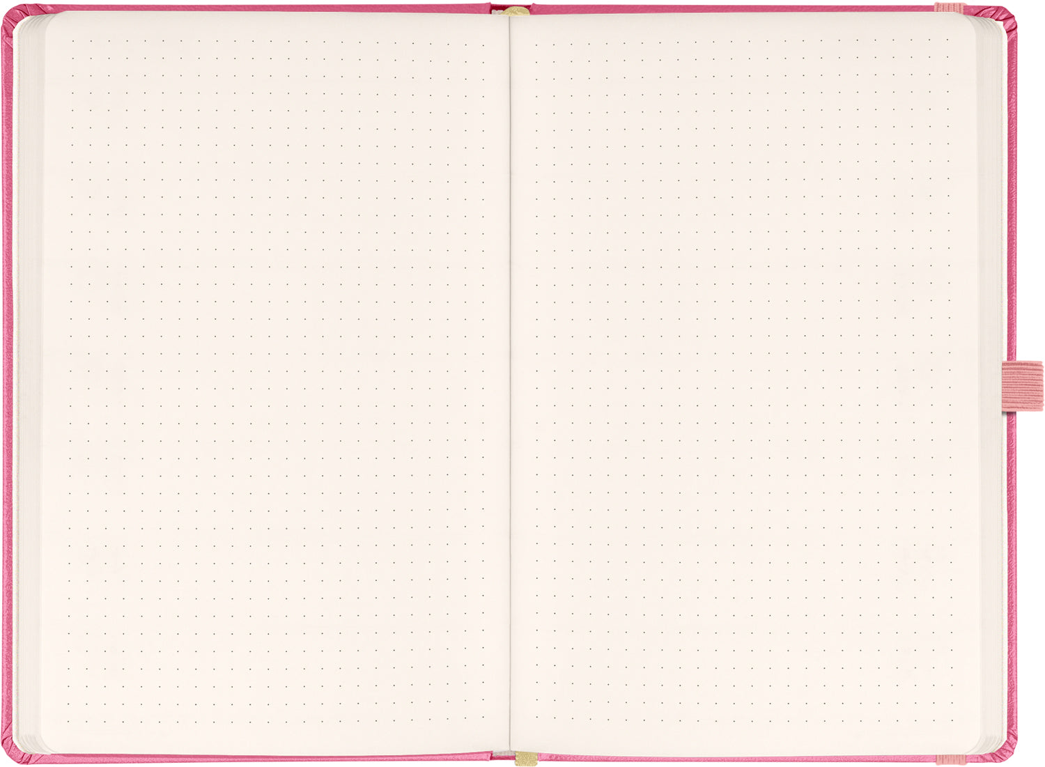 Das praktische leichte gepunktete Notizbuch in trendigem Pink mit fein strukturierter Oberfläche, auf die Sie Ihr Firmenlogo prägen lassen können. Das Notizbuch hat einen stabilen Bucheinband, abgerundete Ecken, eine Stiftschlaufe, ein Gummiband und ein Stofflesezeichen. Die Linien haben 5 mm Abstand und sind auf hochwertigem gelblichem Papier gedruckt.