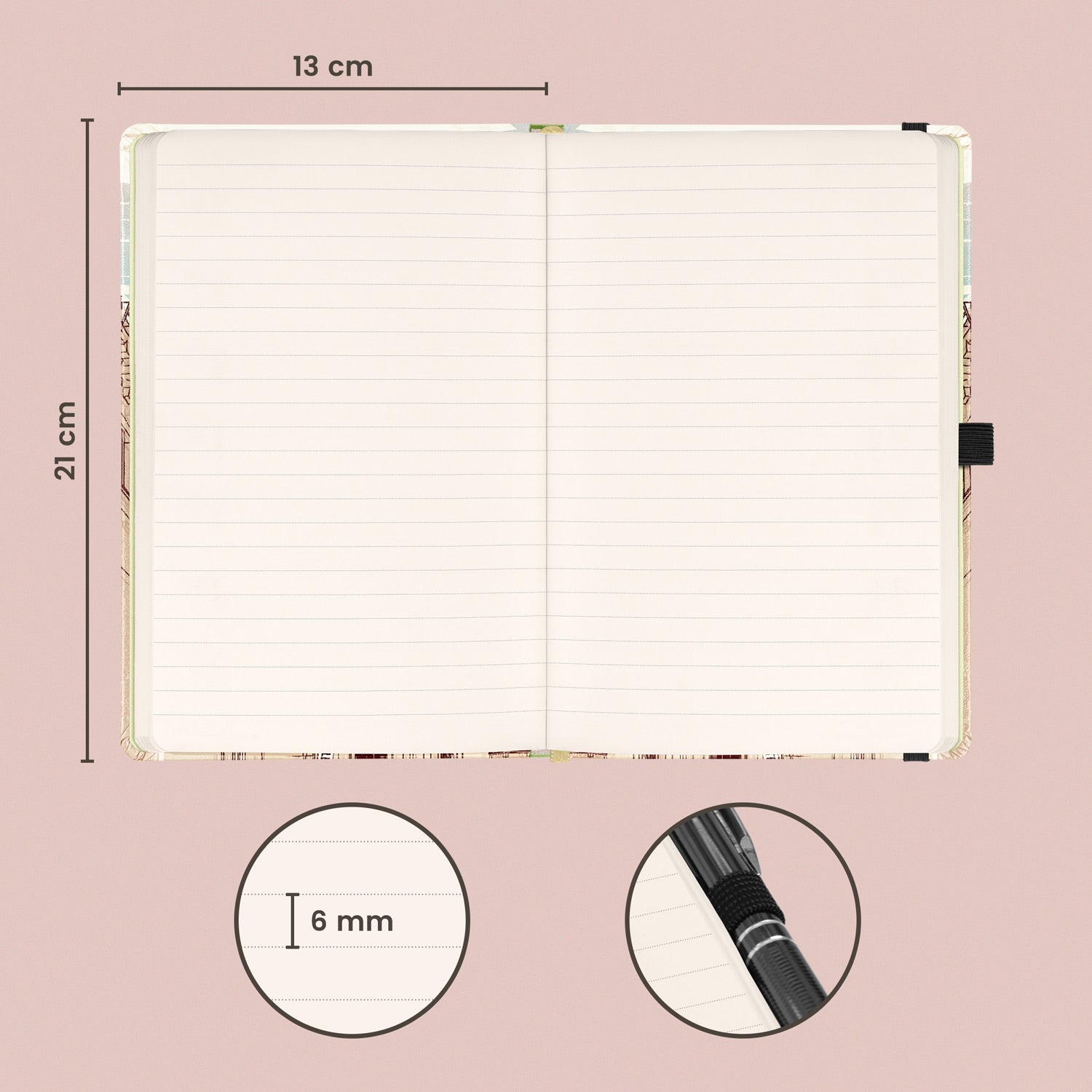 Hochwertiges liniertes Notizbuch aus festem Karton mit elastischem Verschluss, Bleistiftschlaufe und Innentasche für Kleinigkeiten. Im Inneren finden Sie 172 gepunktete Seiten auf gelbem Papier, auf denen Sie all Ihre Ideen notieren können. Sie können das linierte Notizbuch als Tagebuch verwenden, um tiefe Gedanken oder Arbeitsnotizen darin zu schreiben.