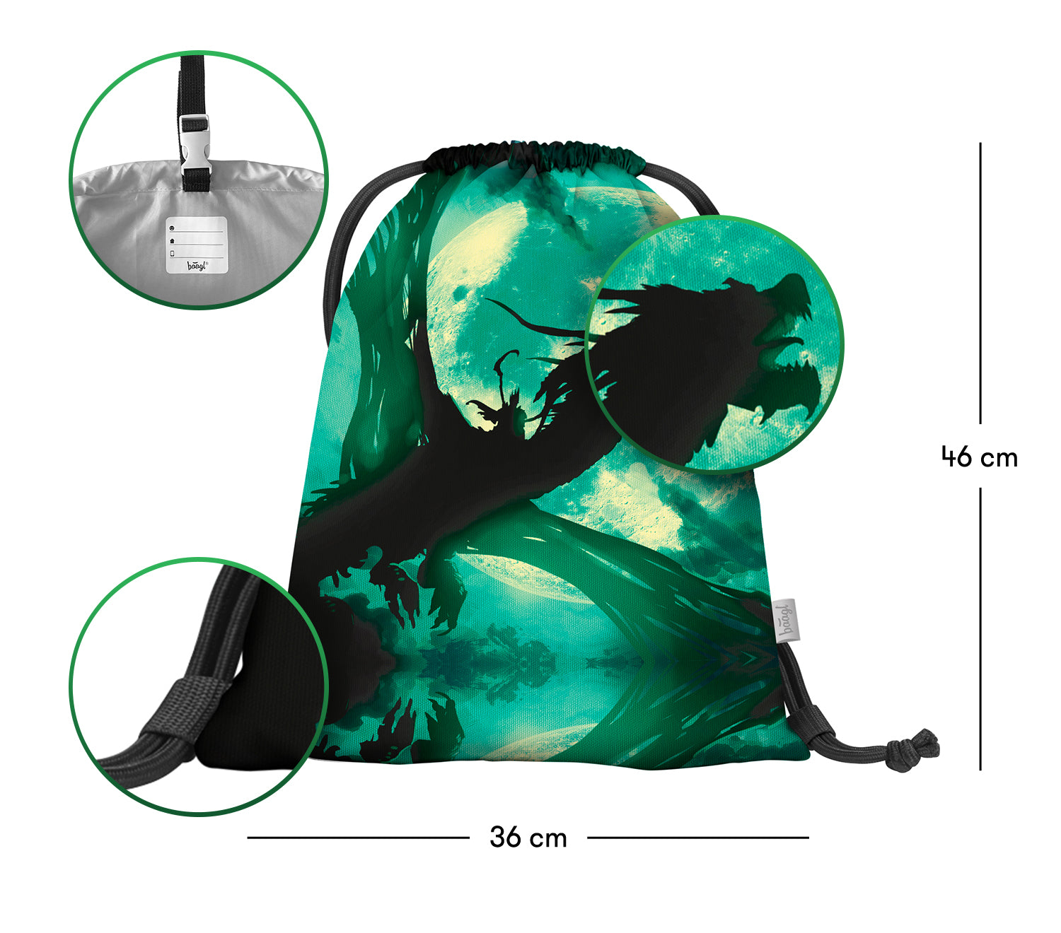 Grüner Schuhbeutel mit Drachen-Motiv aus festem, wasserabweisendem Material mit dicken Kordelzüge für bequemes Tragen auf dem Rücken.