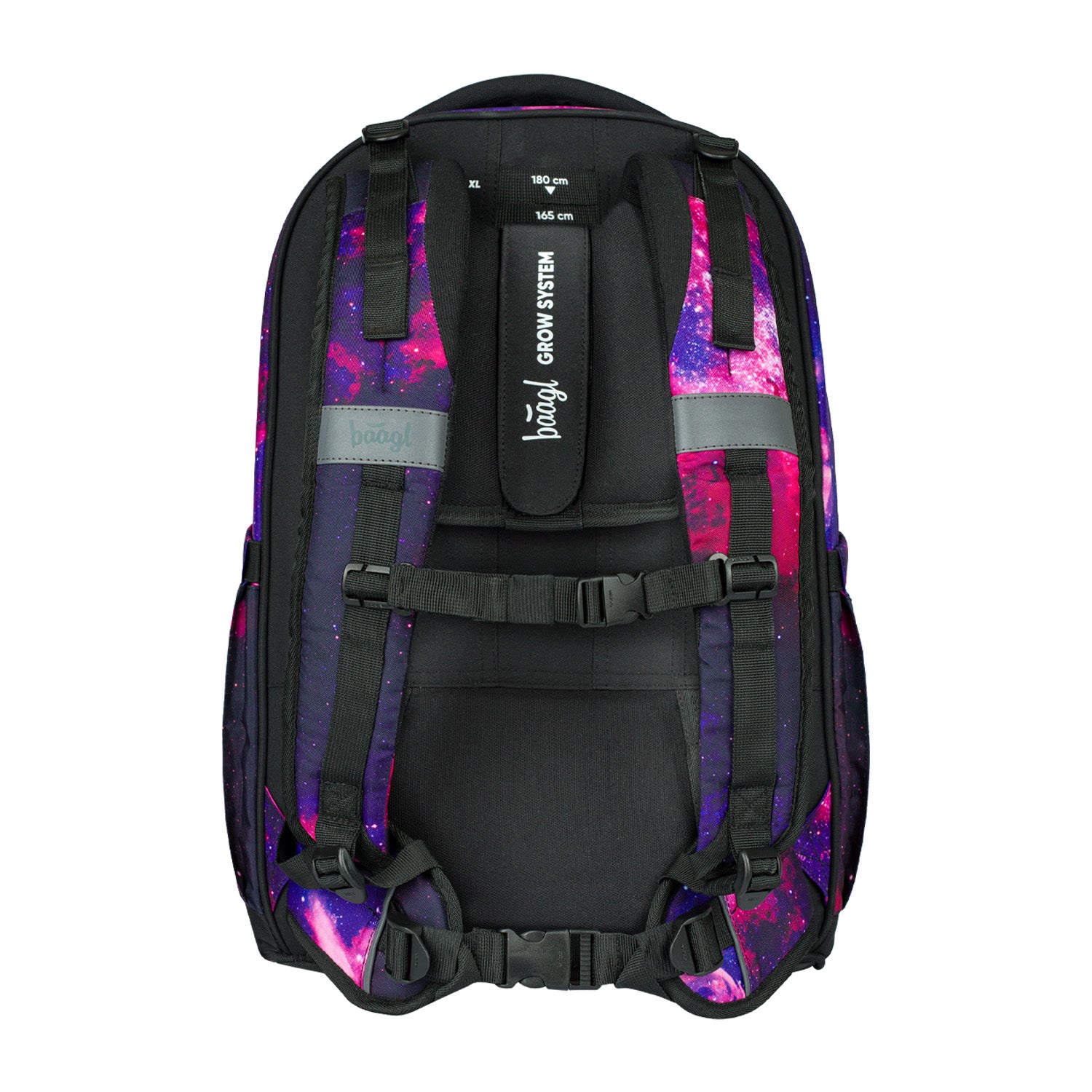 Außergewöhnlicher Schulrucksack Skate Max mit BAAGL-Logo und Galaxie-Motiv – bereit für den Orbit! Gepolstertes Laptopfach und verstellbares Rückensystem für optimale Passform in vier Größen.