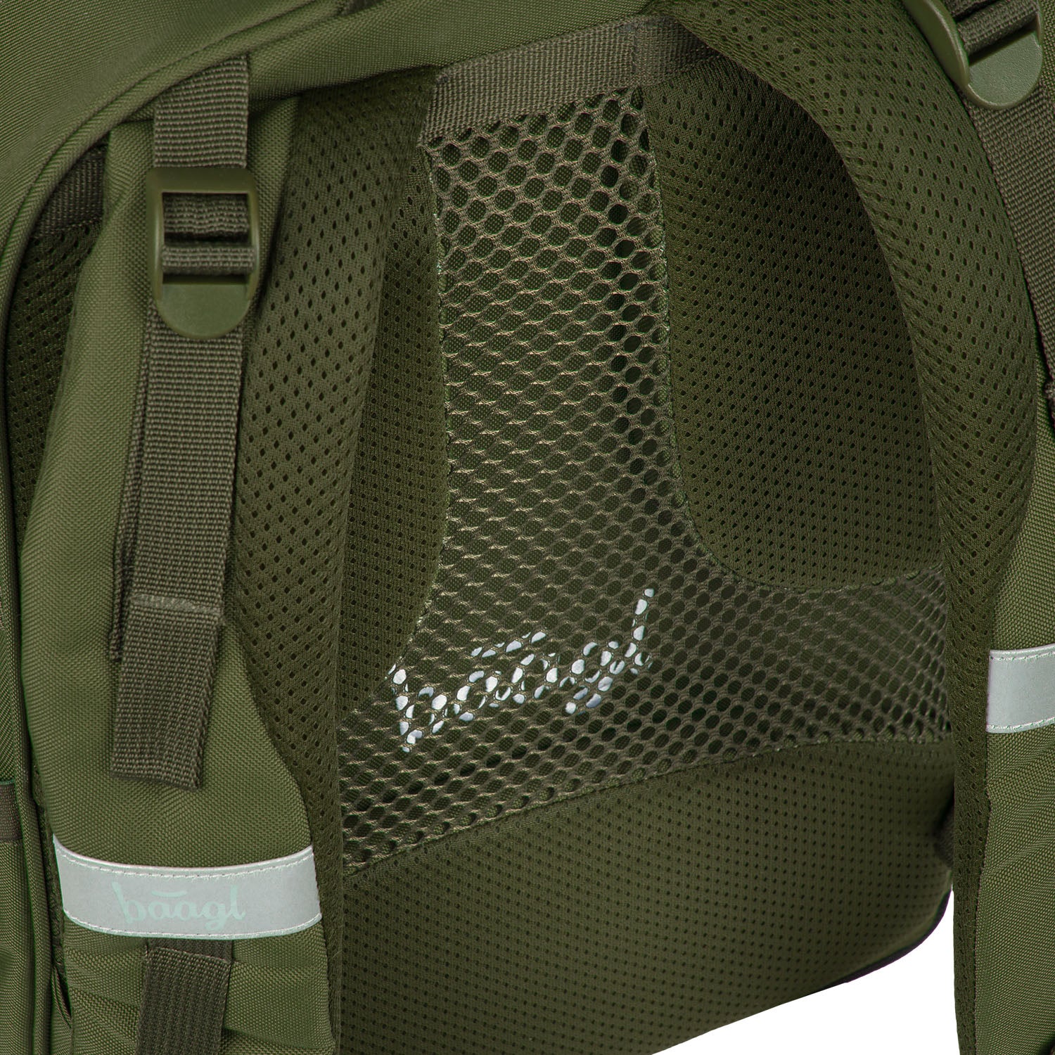 Designrucksack in trendigem Olivgrün mit Skateboard-Halterungen und reflektierenden Sicherheitselementen, die gute Sichtbarkeit bei Dämmerung und schlechten Lichtverhältnissen gewährleisten.