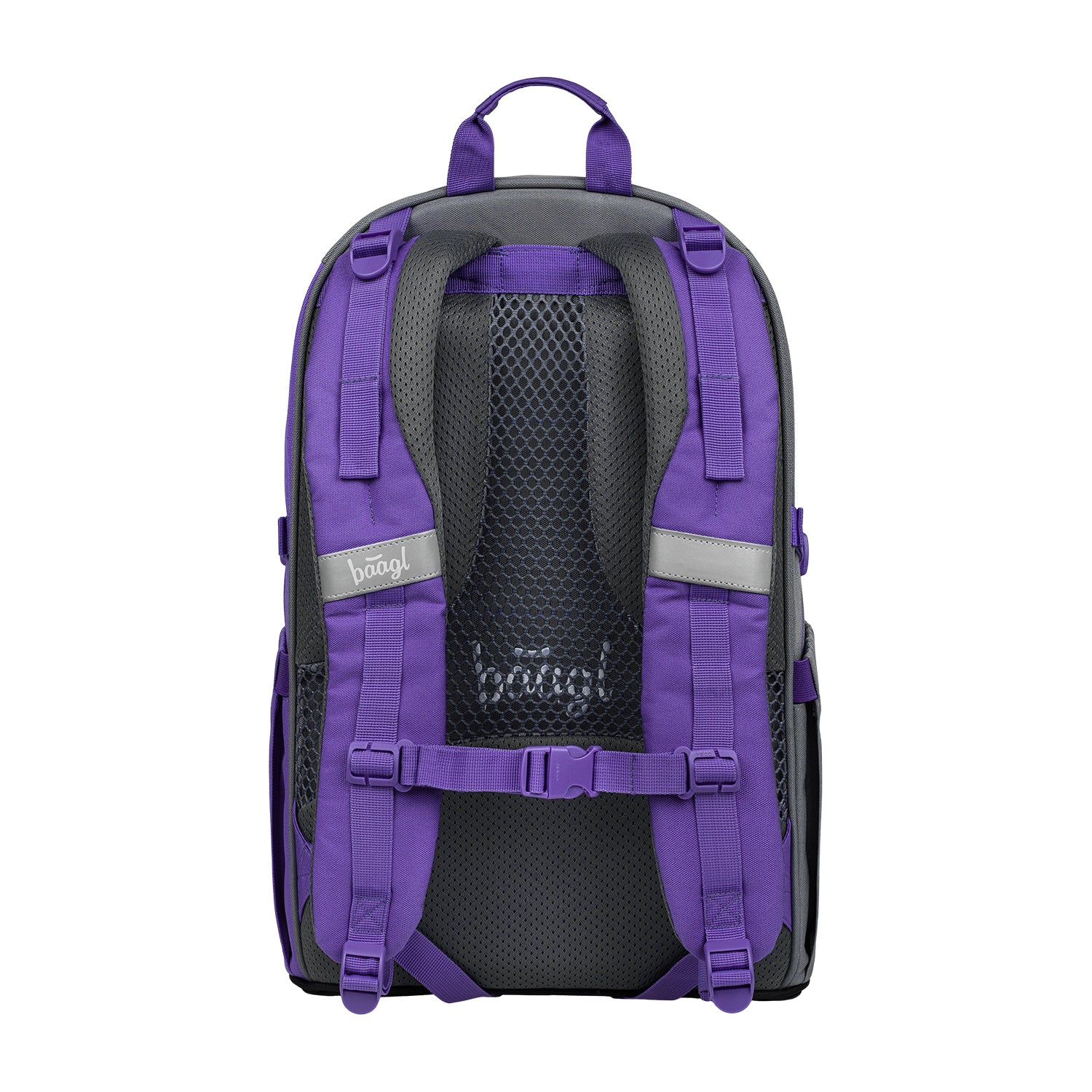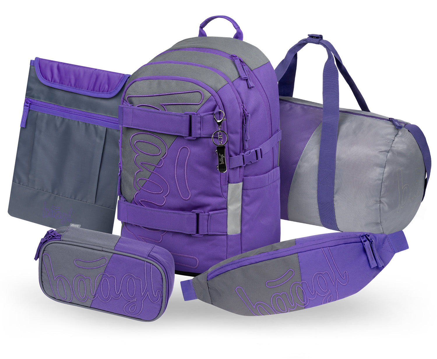 Schulset Skate Dual in attraktiver Grau-Violett-Kombination umfasst ergonomischen Rucksack, Federmäppchen, faltbare Sporttasche, stylische Bauchtasche und praktische Laptophülle – alles zum Vorteilspreis.