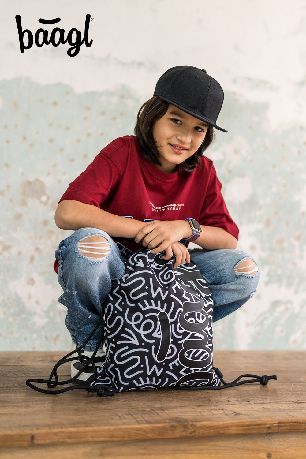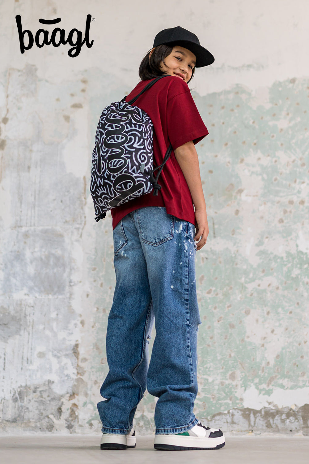 Praktischer Schuh- oder Turnbeutel mit Streetart-Motiv und BAAGL-Logo aus recyceltem Material.