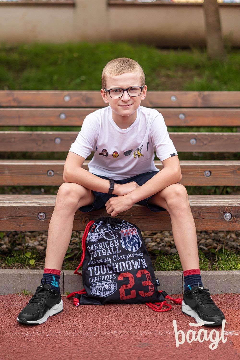 Schwarzer Turnbeutel mit einem vom rauen Football inspirierten Motiv.