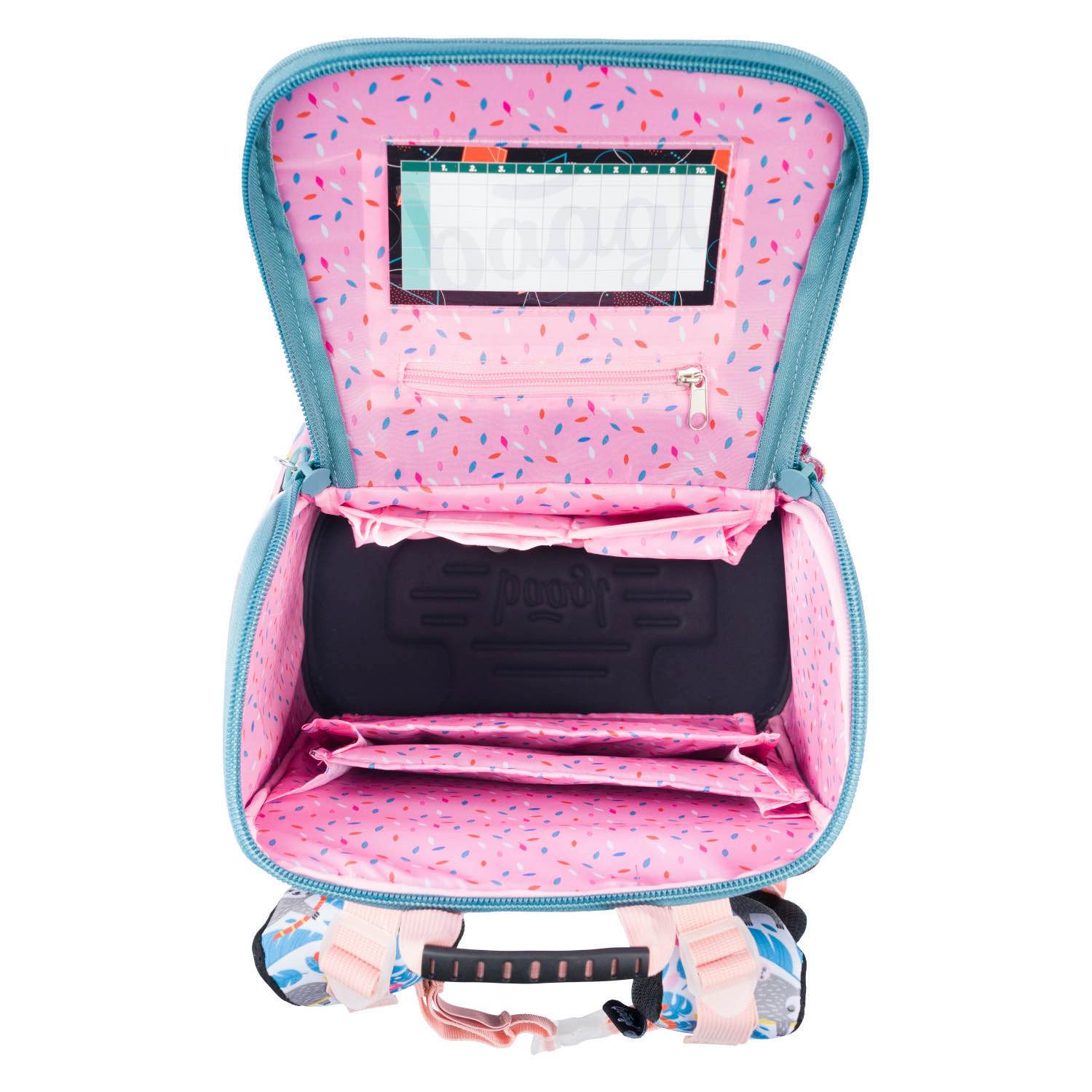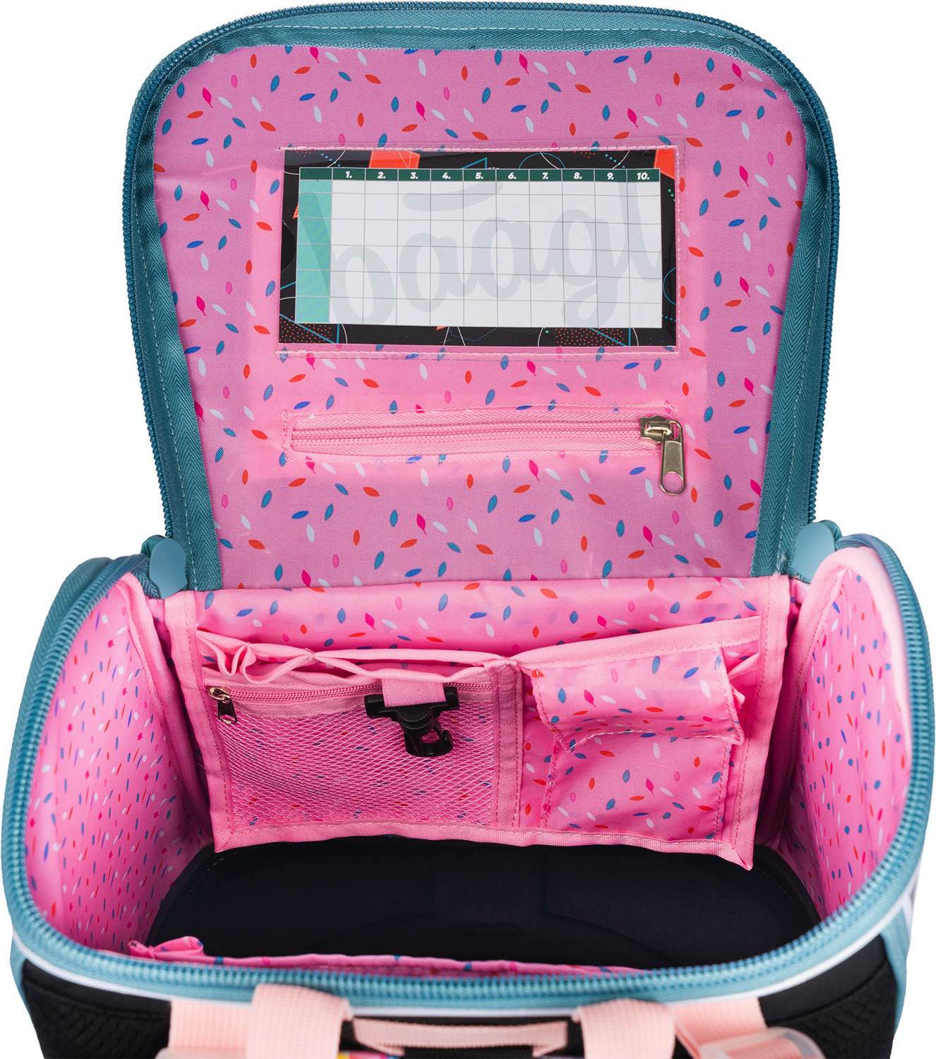 • Im Inneren des Schulranzens befinden sich ein transparentes Fach für Stundenplan sowie ein Organizer mit einem elastischen Band zur Fixierung, das für eine gleichmäßige Gewichtsverteilung sorgt.