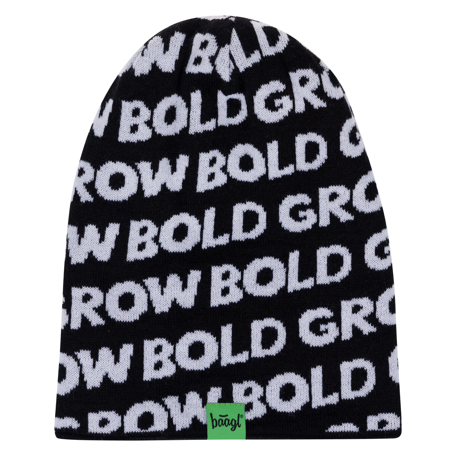 • Schwarze Beanie-Mütze mit weißem GROW BOLD-Schriftzug.