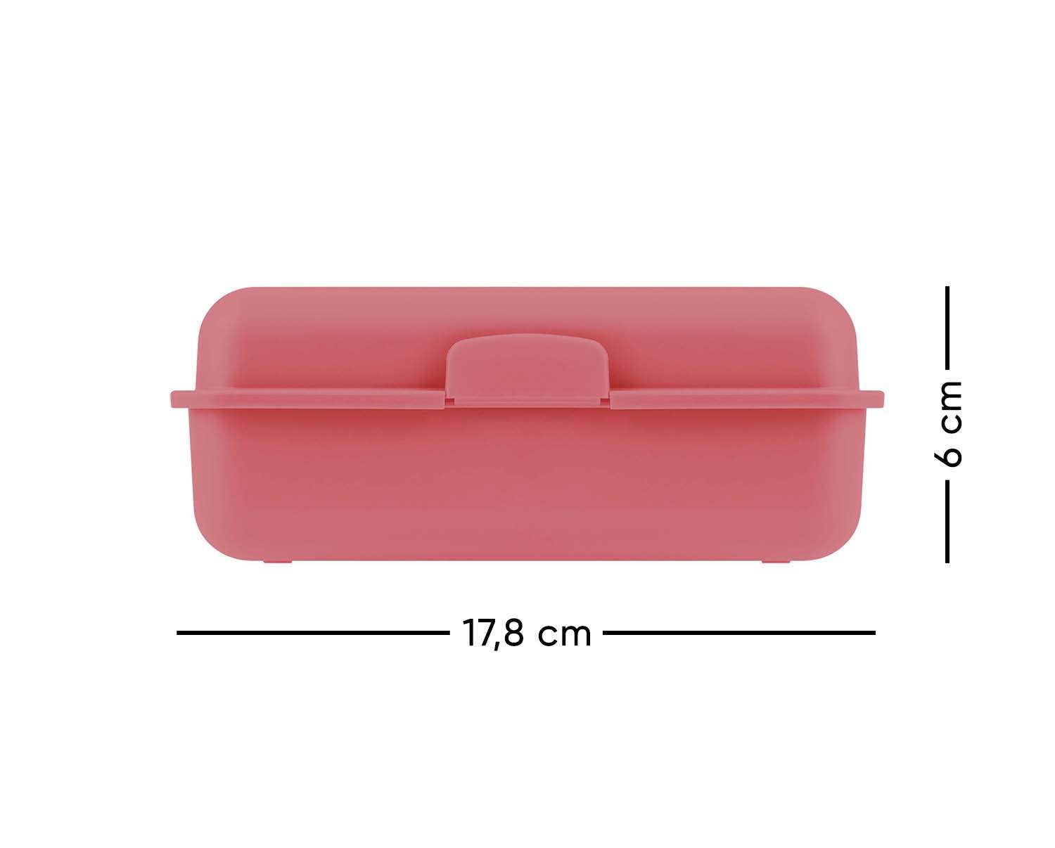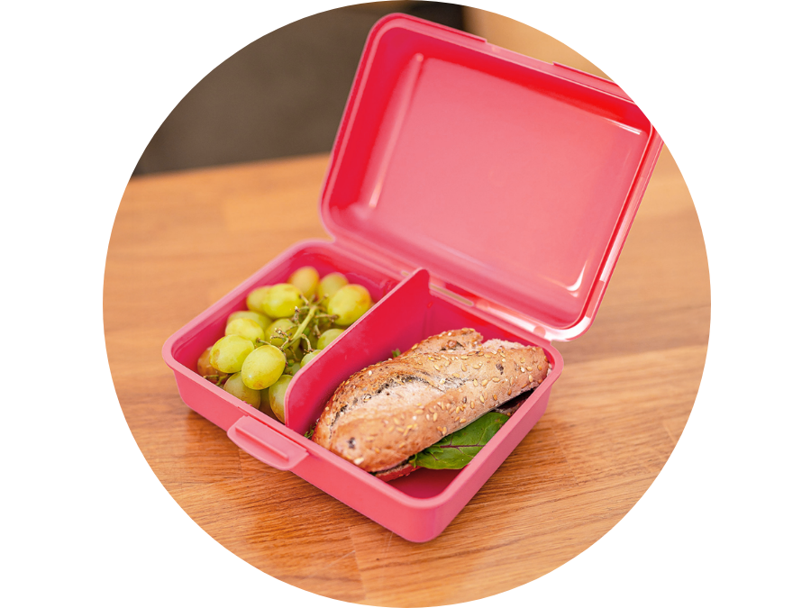 • Snackbox aus Kunststoff mit innerer Trennwand.