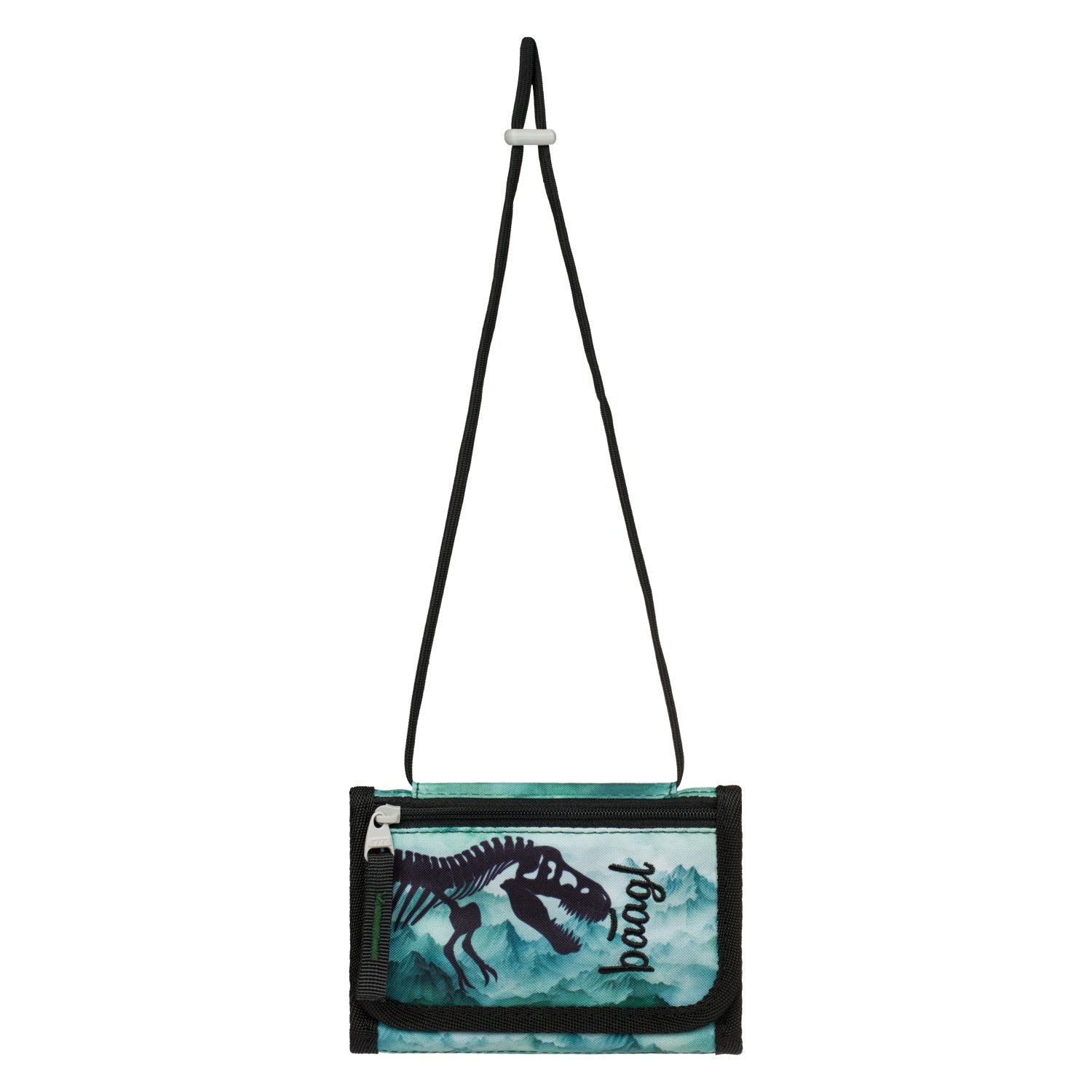 Vergünstigtes Schulset mit Schulranzen ERGO, austauschbaren Patches, klassischem Federmäppchen, Turnbeutel, Schürze und praktischer Geldbörse mit Dinosaurier-Motiv.