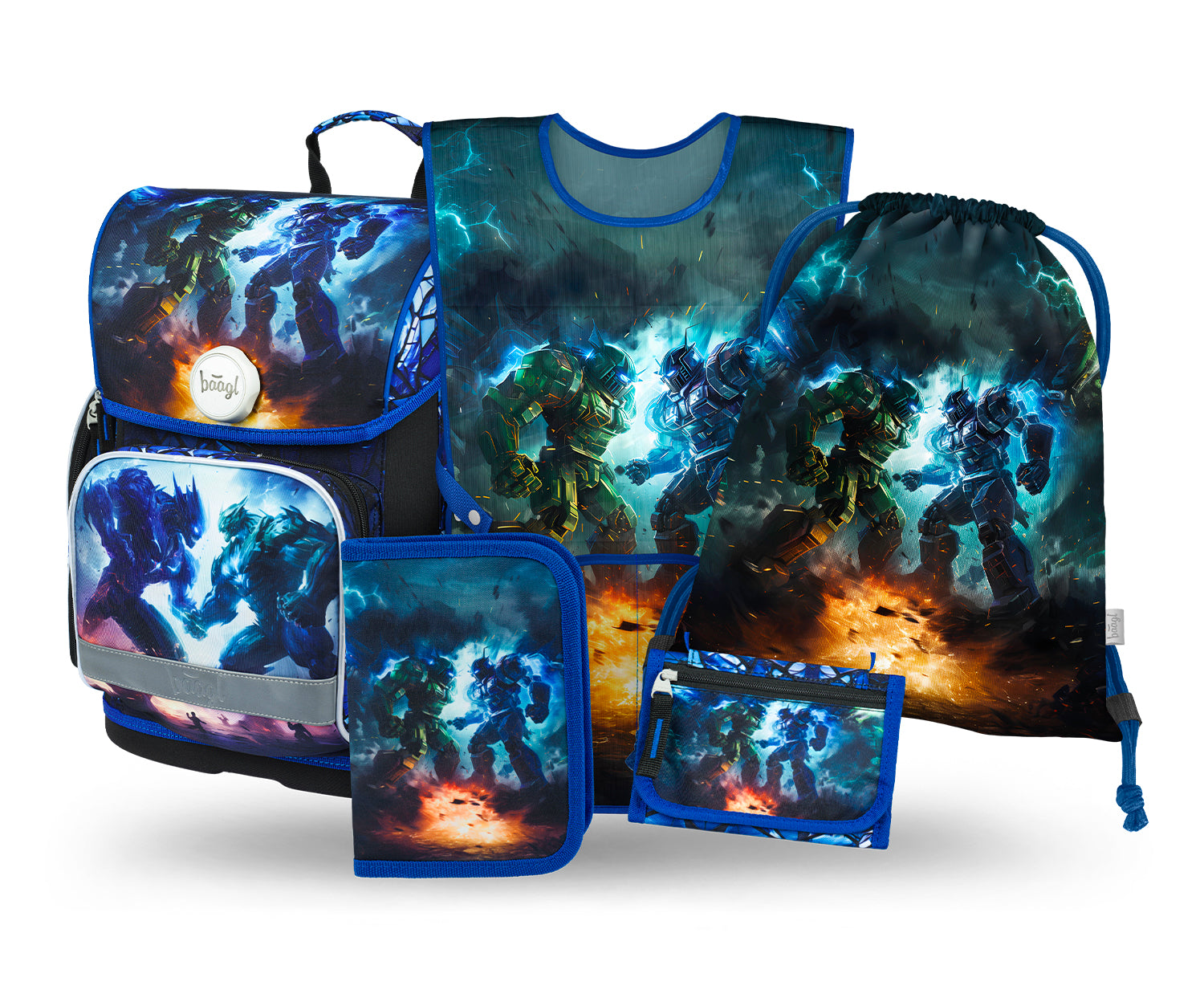 Großes Set mit Roboter-Motiv, bestehend aus Ergo-Schulranzen, Federmäppchen, Turnbeutel, Malschürze für den Kunstunterricht und Geldbörse – komplette Ausstattung für den Schulstart in der 1. Klasse.