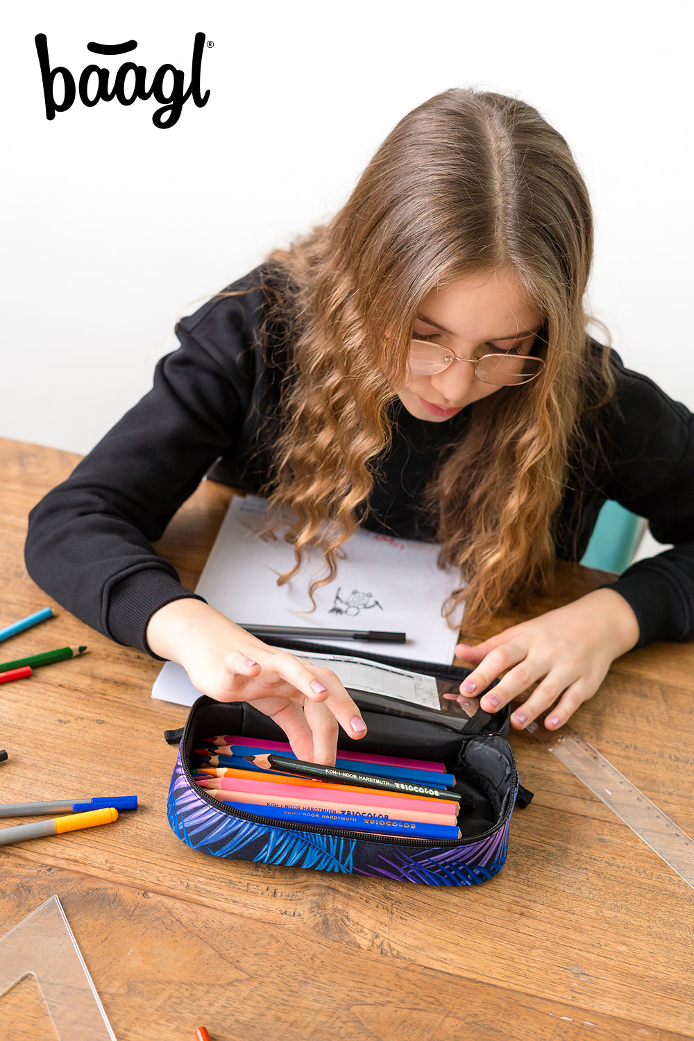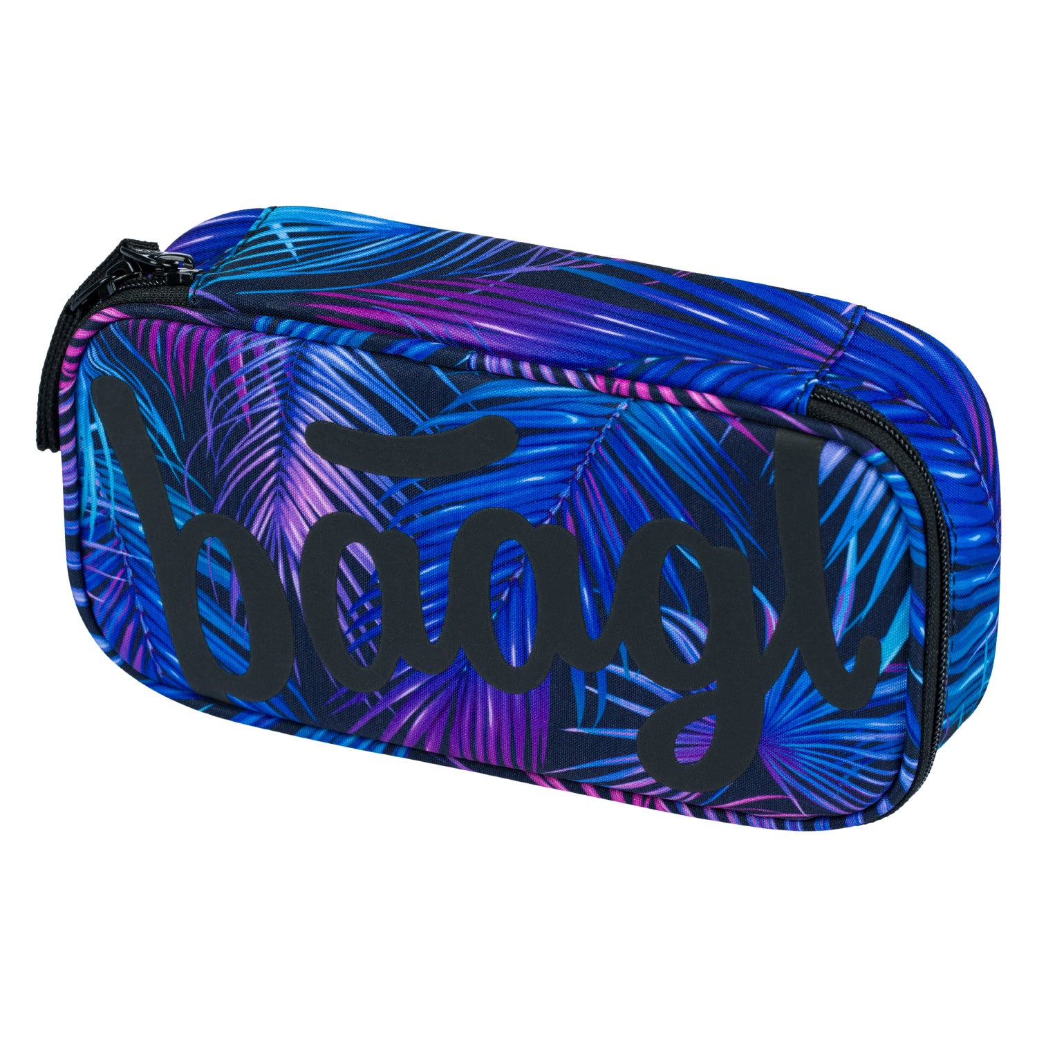 Geräumiges Stiftemäppchen mit Blattmotiv und BAAGL-Logo. Das Mäppchen enthält ein Hauptfach und ein Klappfach mit Trennwand und Gummibändern für Stifte und andere Schreibutensilien.