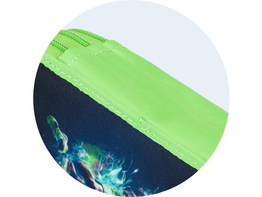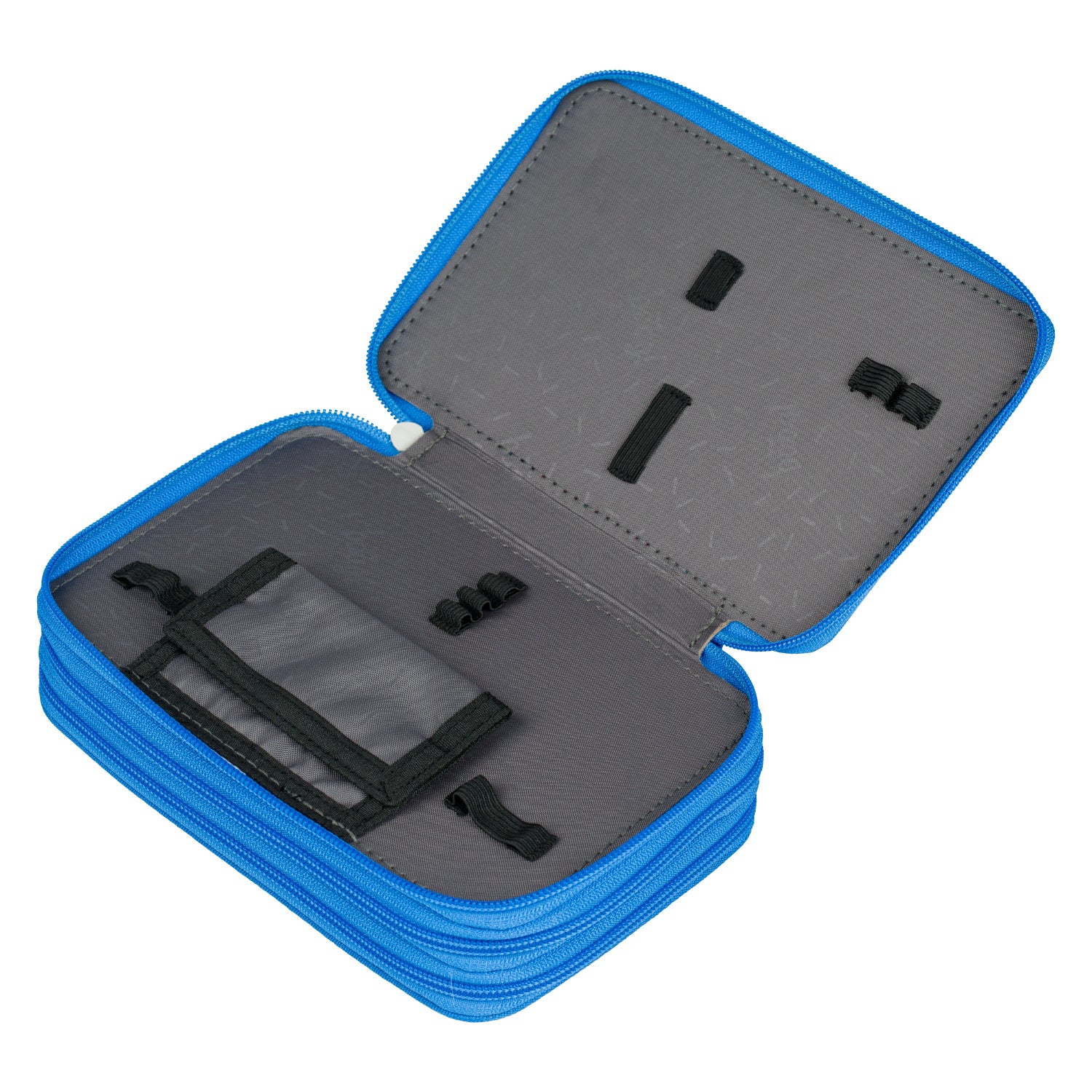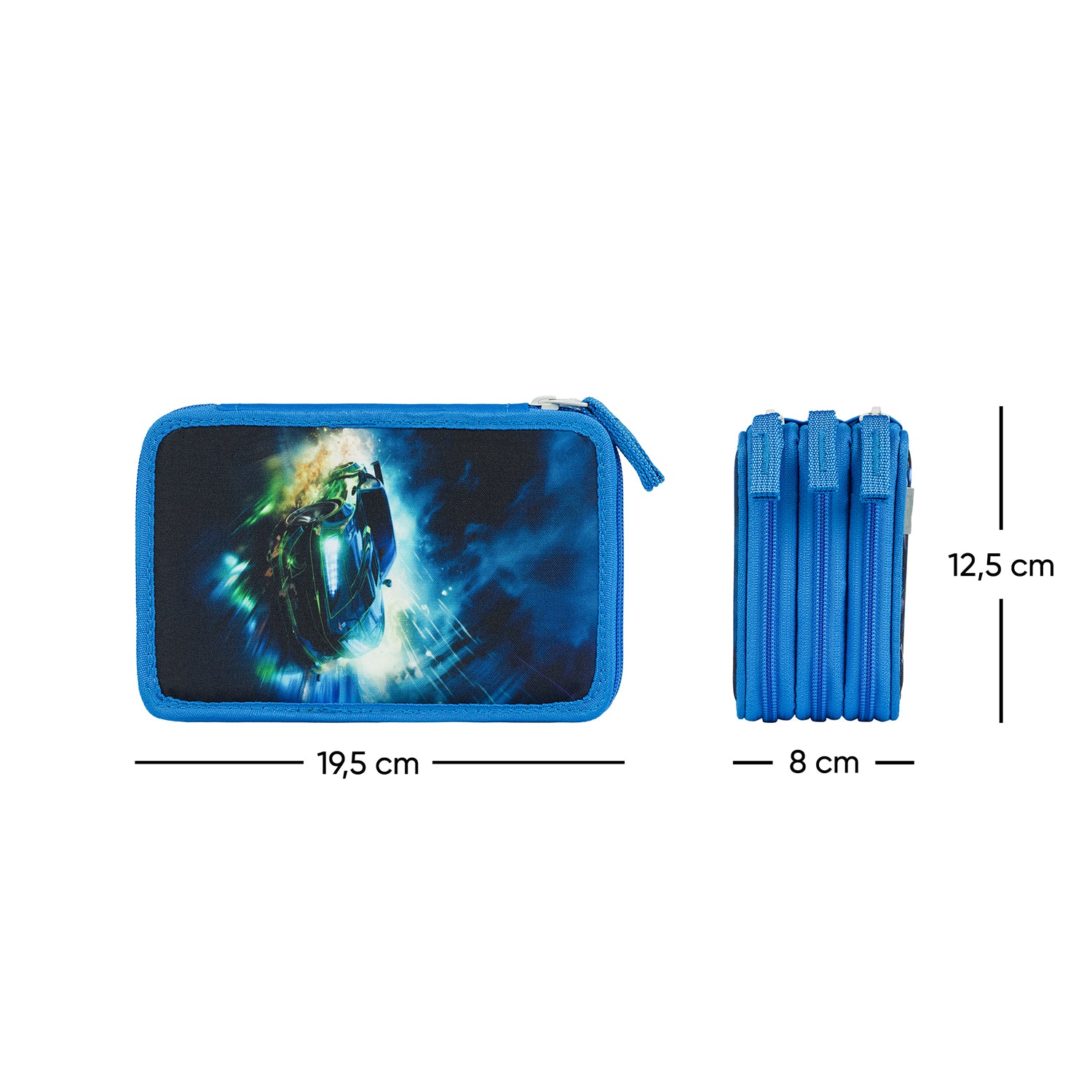 Dreifaches Federmäppchen mit Auto-Motiv und starken Reißverschlüssen. Hochwertige Gummibänder im Inneren des Mäppchens halten auch dickere dreieckige Buntstifte und Marker.