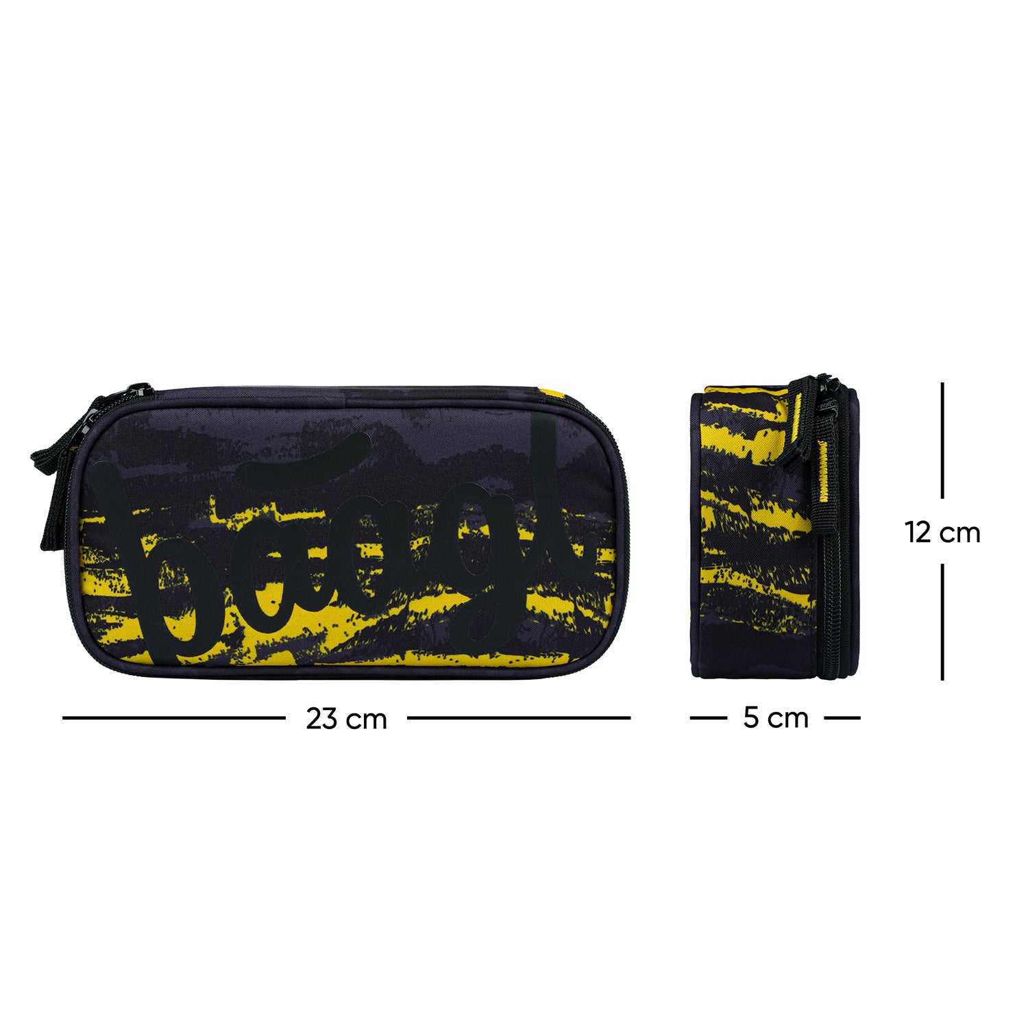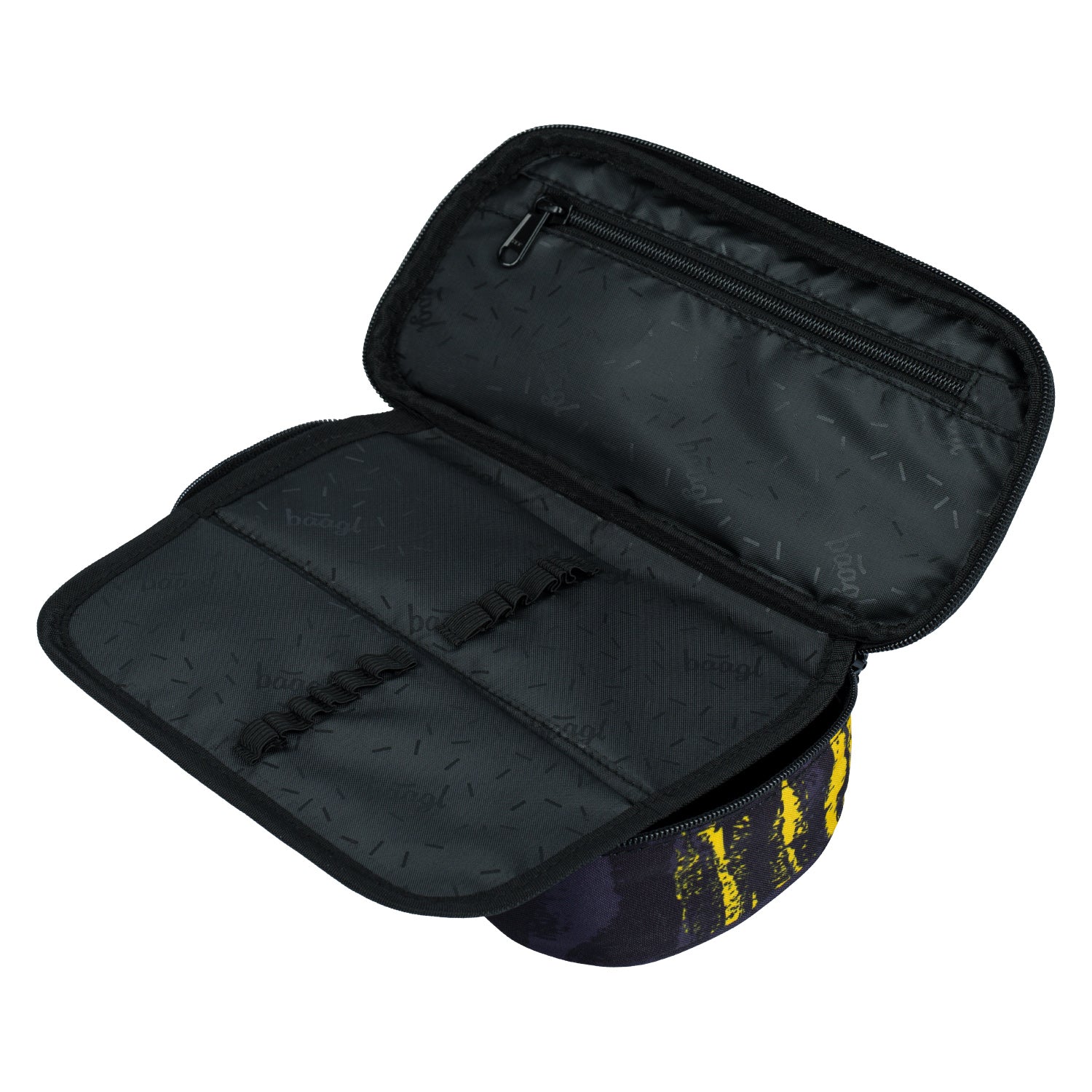 Geräumiges schwarz-gelbes Federmäppchen mit BAAGL-Logo. Das Federmäppchen aus recyceltem Material verfügt über ein Hauptfach und ein Klappfach mit Trennwand und Gummibändern für Stifte und andere Schreibutensilien.