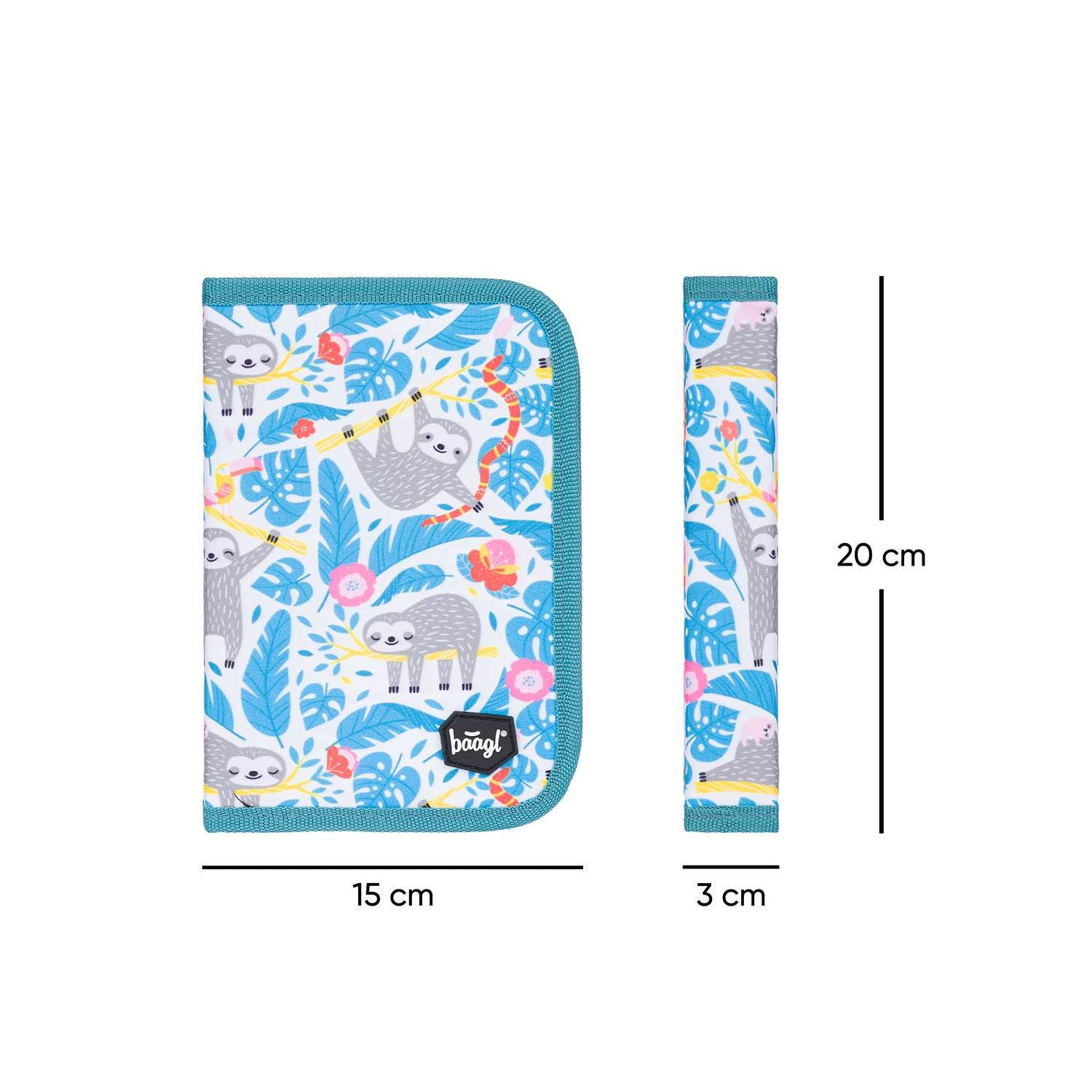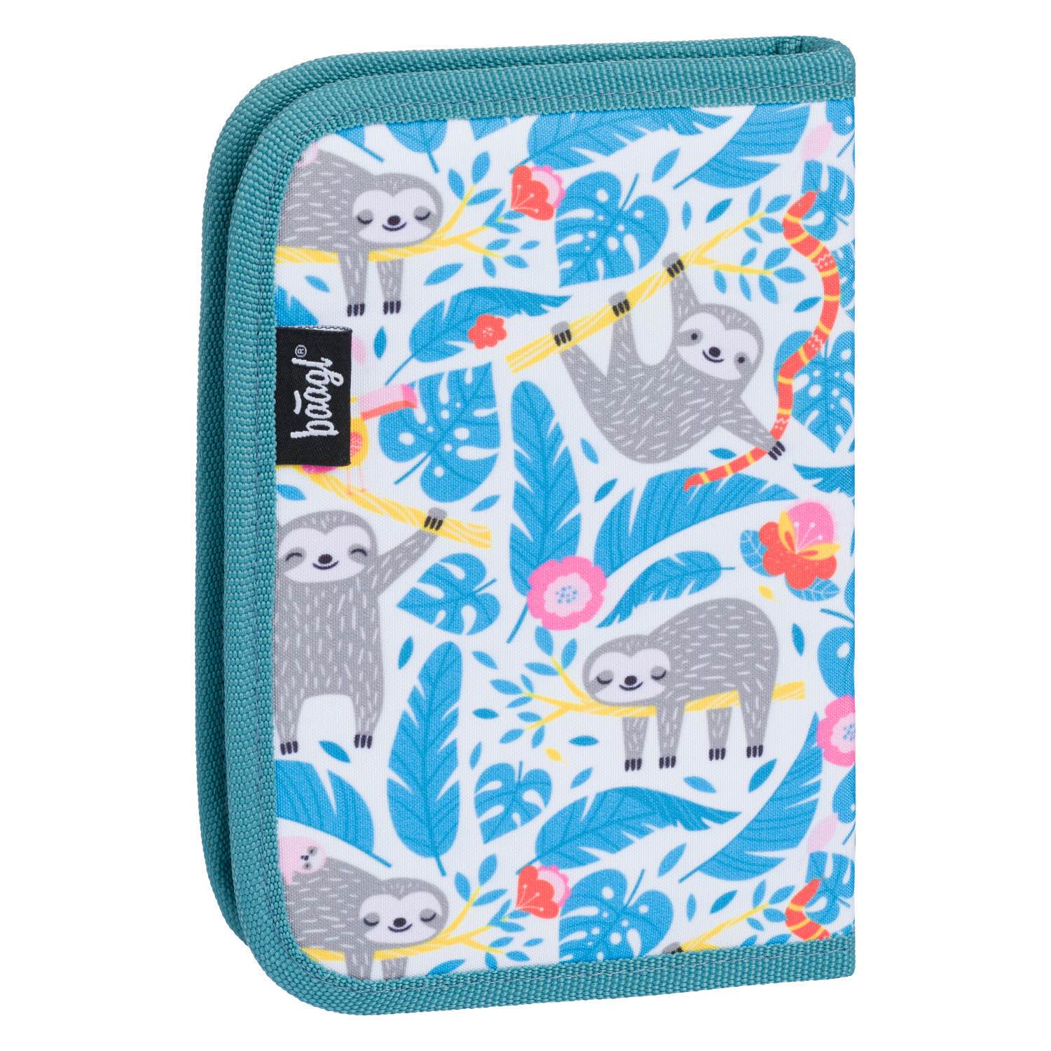 Klassisches blaues Federmäppchen mit zwei Klappen und Faultier-Motiv, geeignet für Schulkinder ab der 1. Klasse Grundschule.