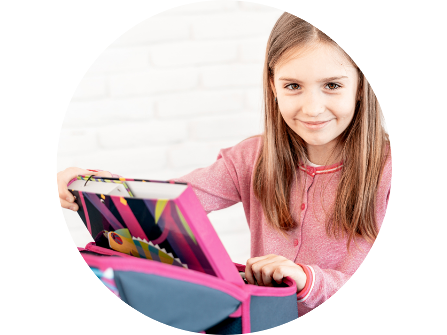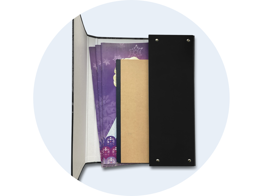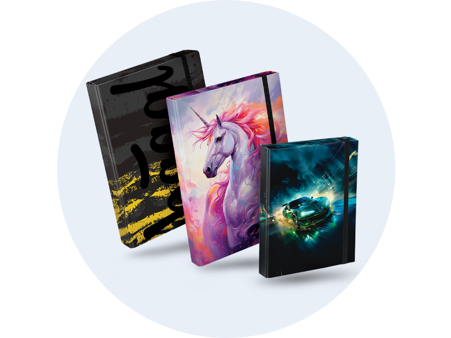 • Mappe zur Aufbewahrung von Heften und anderen Dokumenten, mit einer Innenklappe gegen Herausfallen, die mit einem Gummiband gesichert ist.