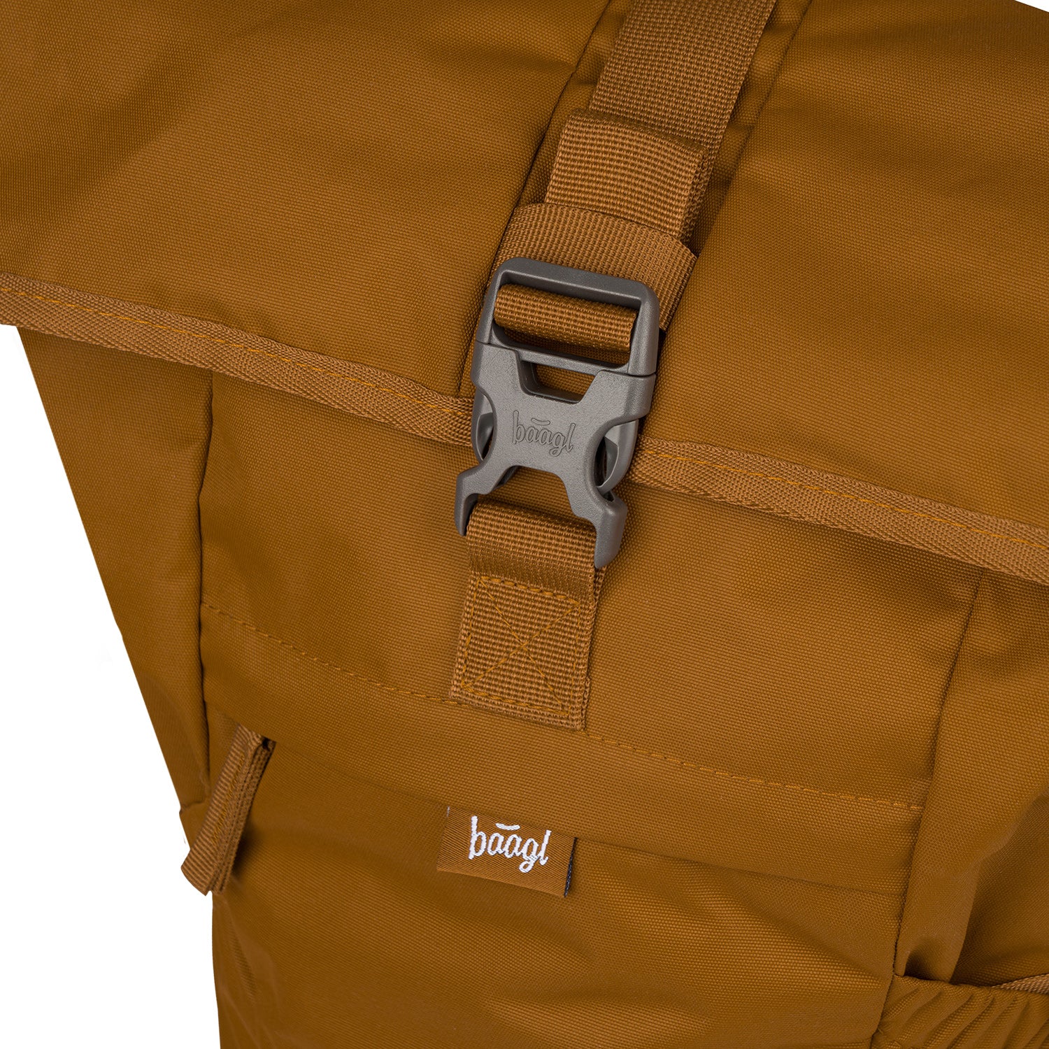 Roll-Top-Rucksack Caramel mit minimalistischem BAAGL-Logo – einzigartiges Design mit praktischen Features, perfekt für Alltag und Outdoor-Abenteuer.