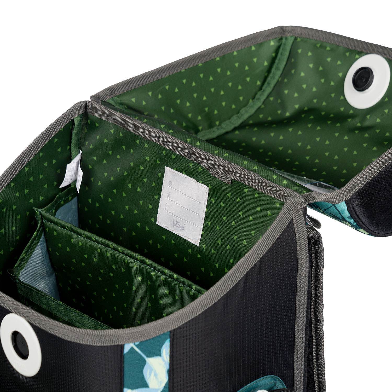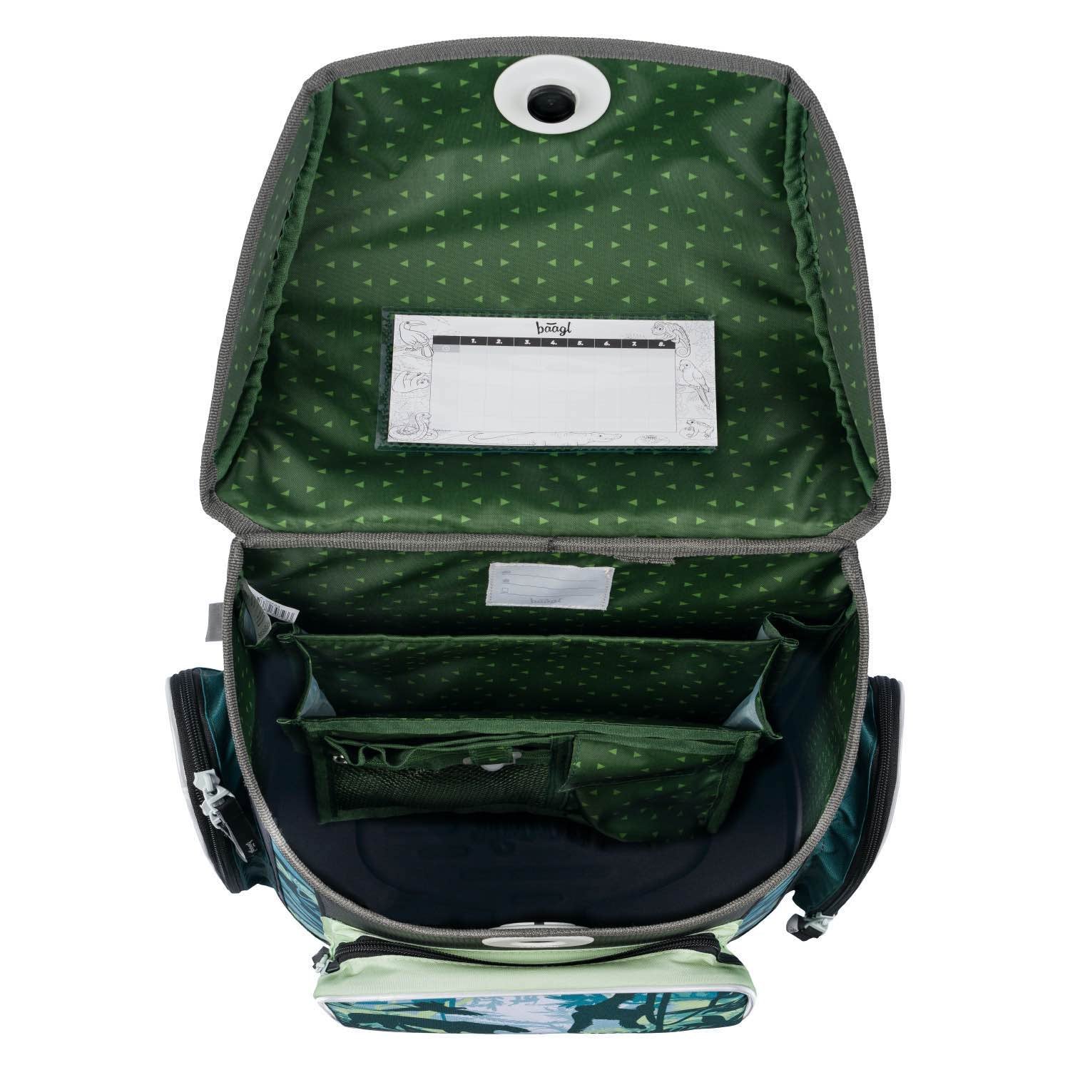 • Im Inneren des Schulranzens befinden sich ein transparentes Fach für Stundenplan sowie ein Organizer mit einem elastischen Band zur Fixierung, das für eine gleichmäßige Gewichtsverteilung sorgt.