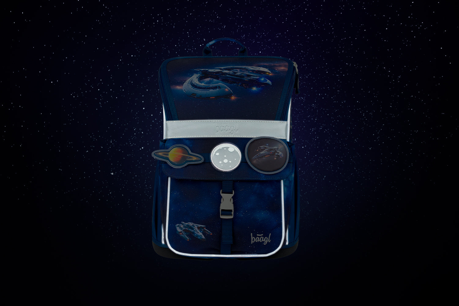Leichter Schulranzen mit Raumschiff-Motiv und verstellbarem Rückensystem, ideal für Kinder ab der 1. Klasse.