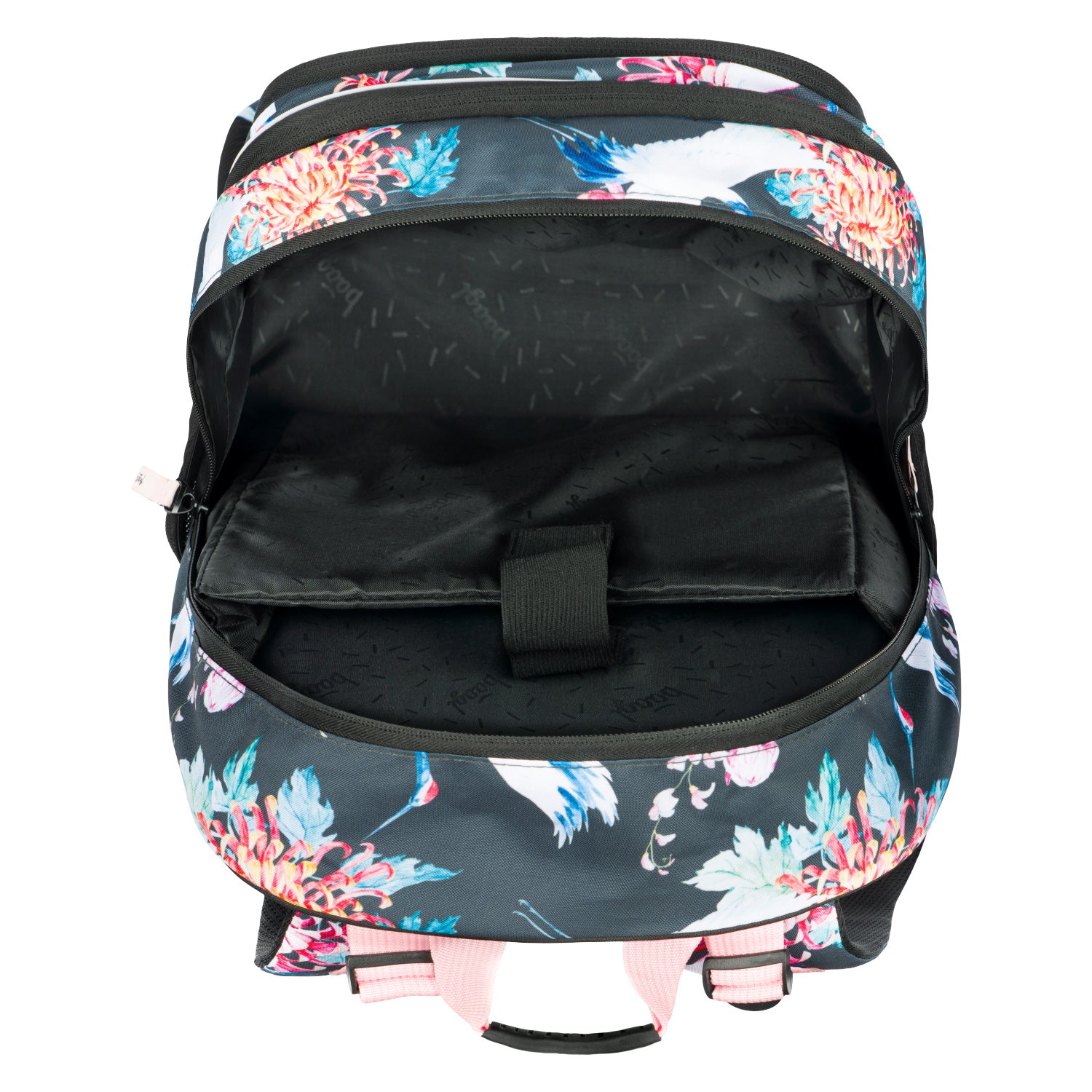 Schulrucksack aus der Core-Serie mit farbenfrohem Blumen- und Vögel-Motiv. Er ist ab der 3. Klasse der Grundschule geeignet.