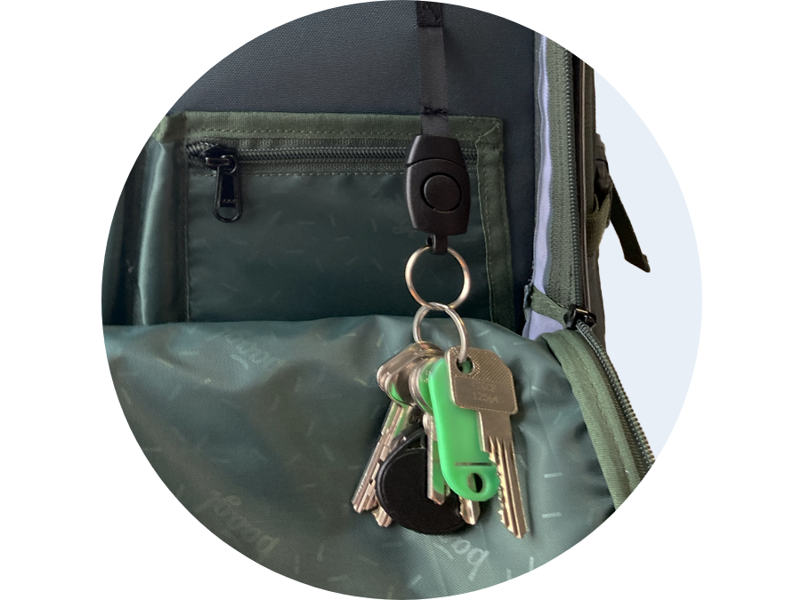 Vordertasche mit Organizer & Schlüsselring mit Karabiner – leicht abnehmbar & separat nutzbar.