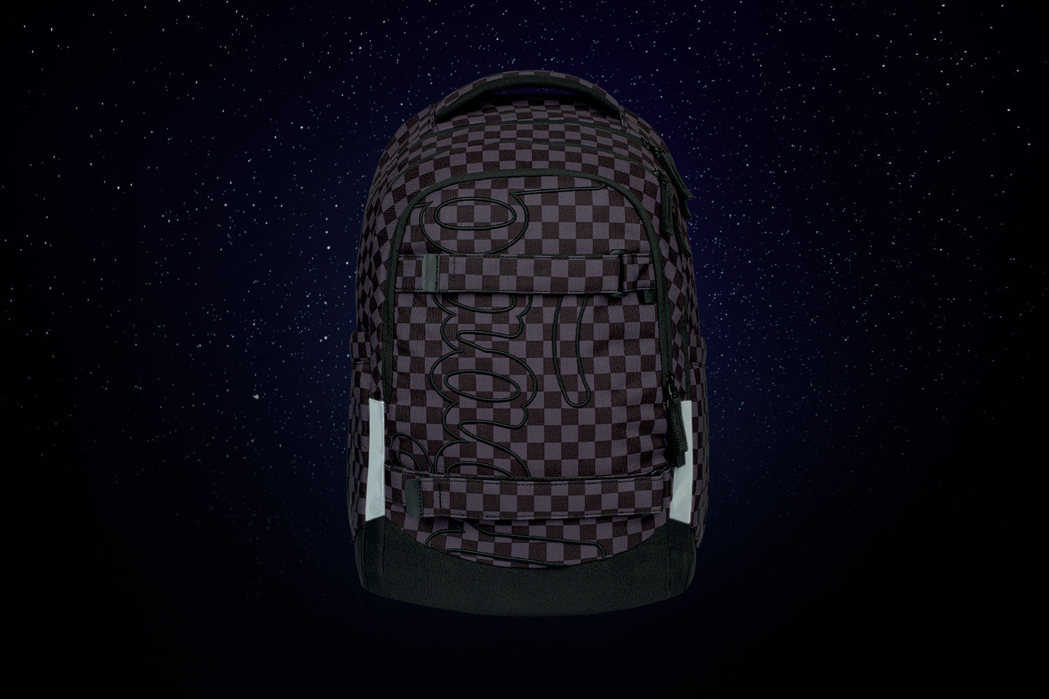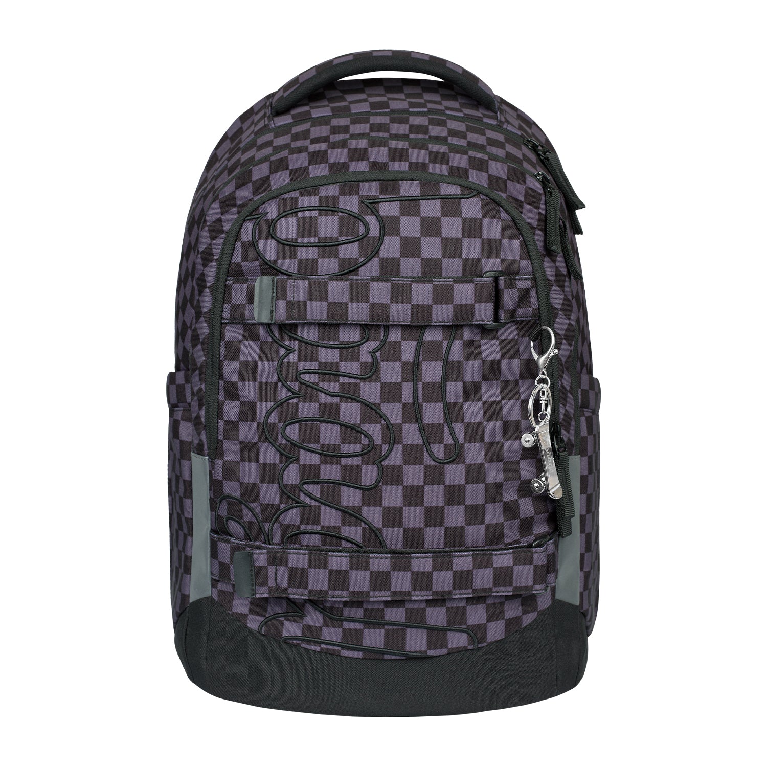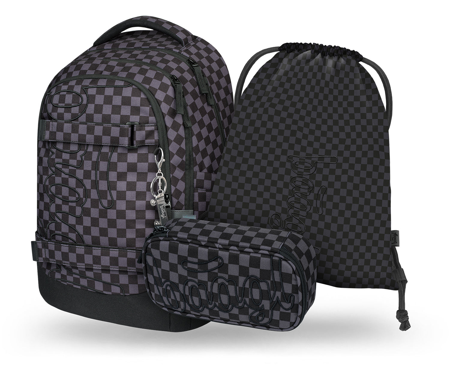 Dunkelgraues Schulset mit ergonomischem Schulrucksack Skate Max mit Riemen zur Befestigung eines Skateboards, Federmäppchen-Etui und Turnbeutel mit Ska-Motiv – geeignet für Kinder ab der 3. Klasse.