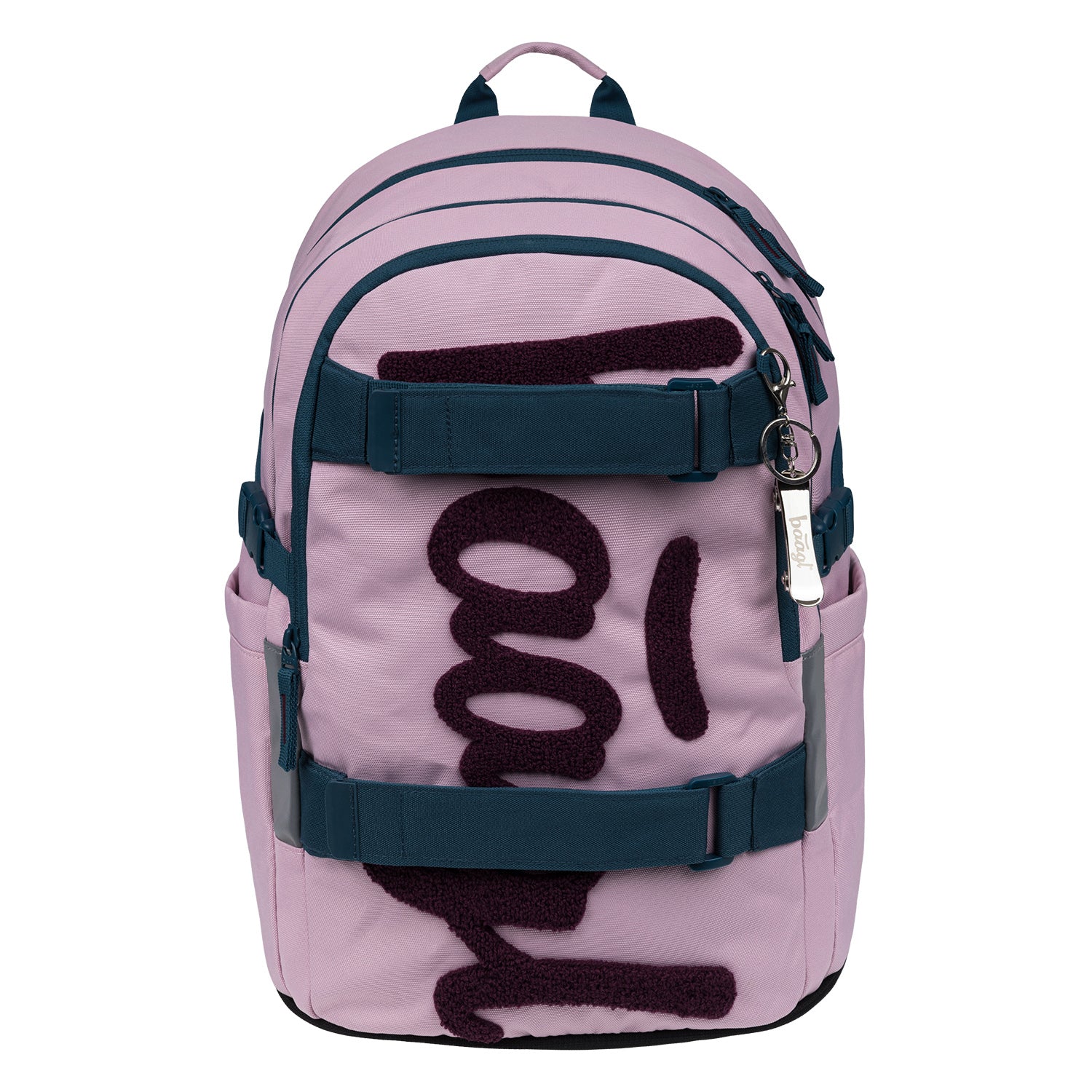 Design-Schulset Skate Rose umfasst einen ergonomischen Rucksack mit Skateboard-Halterungen, Federmäppchen und eine faltbare Sporttasche und ist geeignet für Schüler ab der 3. Klasse der Grundschule.