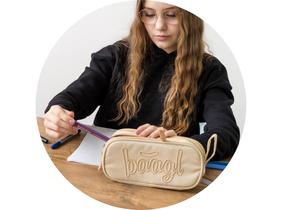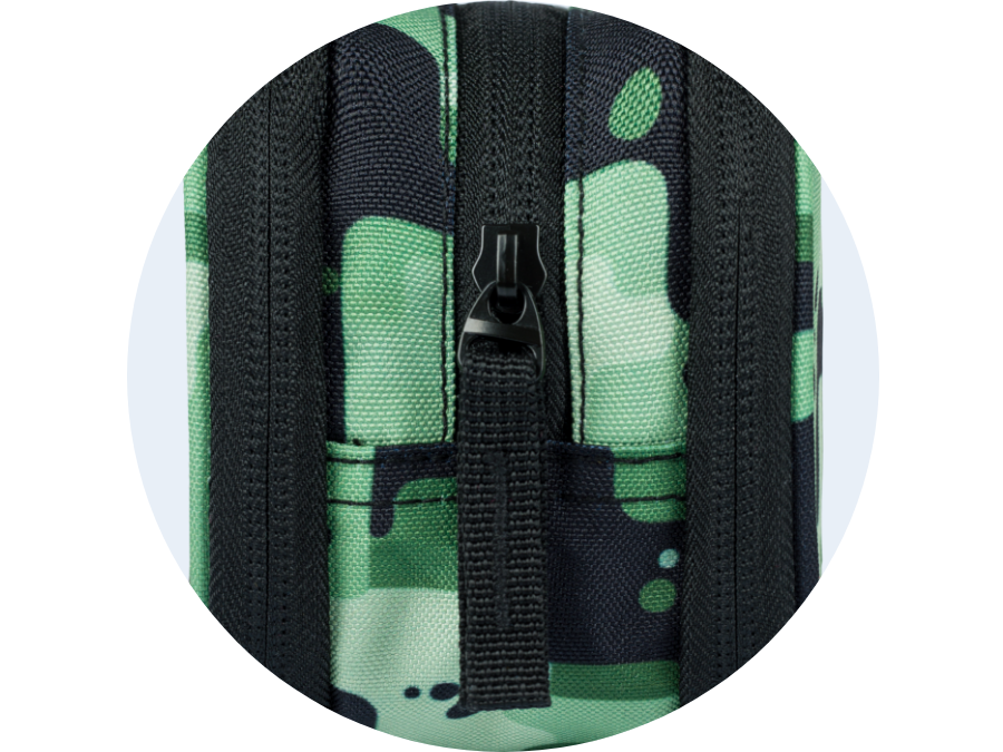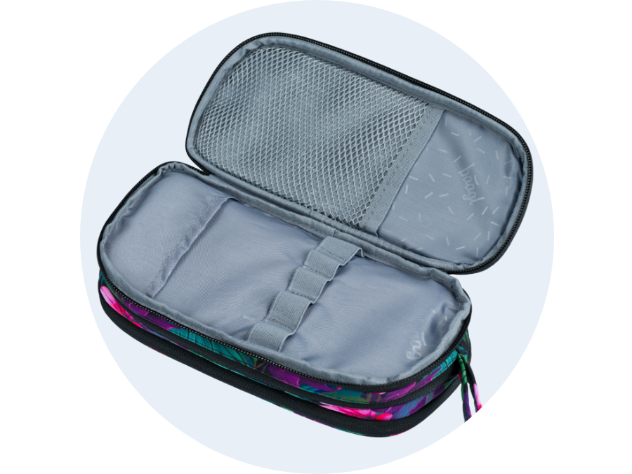 Dunkelblaues Etui mit drei separaten Fächern mit Reißverschluss.
