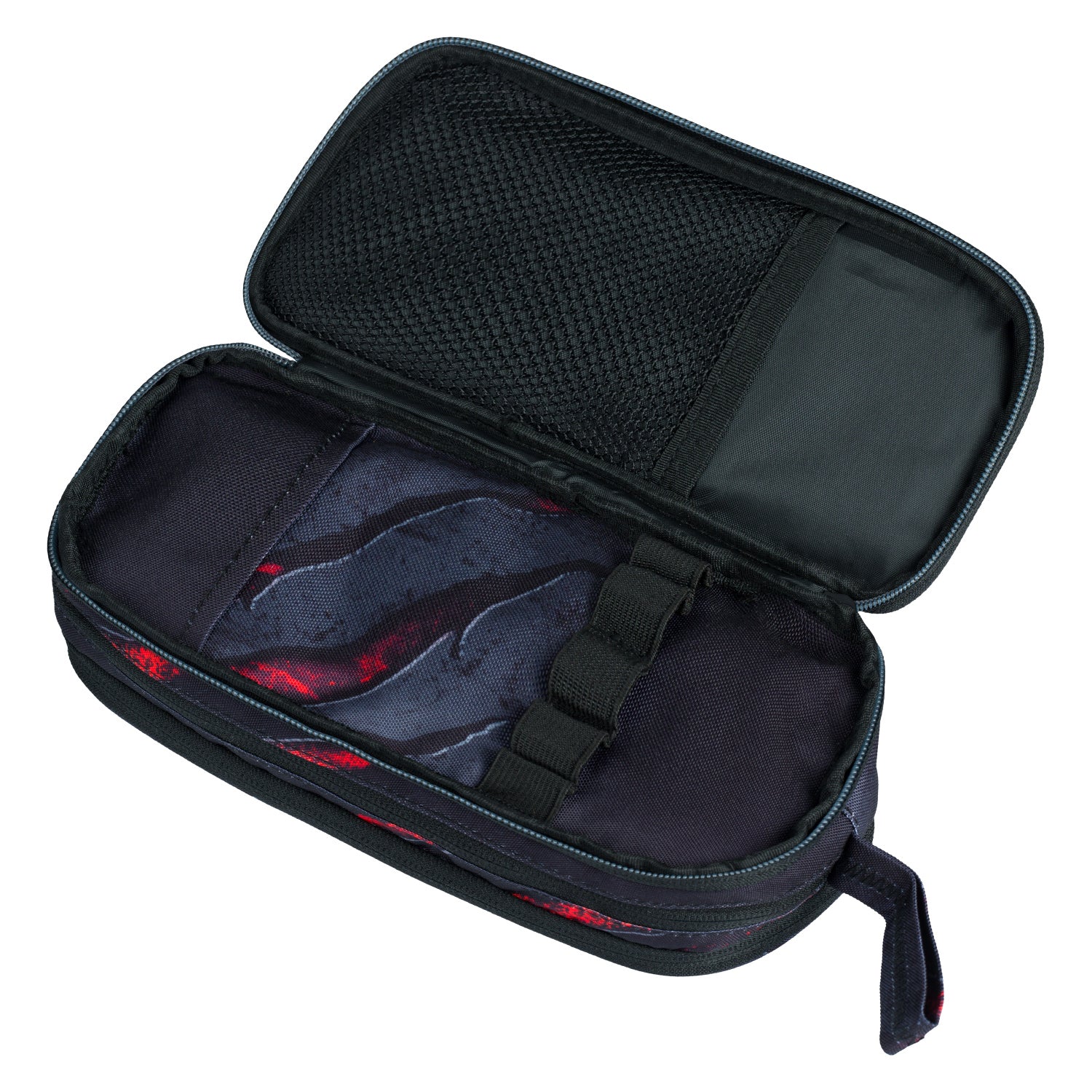 Praktisches schwarz-rotes Mäppchen mit drei Reißverschlussfächern. Lässt sich gut als Federmäppchen für die Schule oder als Reiseetui verwenden.