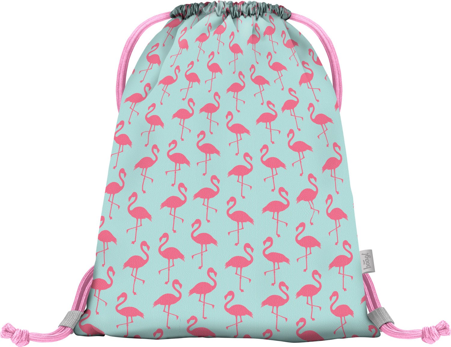 Turnbeutel in Mintgrün und Rosa mit Flamingo-Motiv und praktischer Tasche auf der Vorderseite.