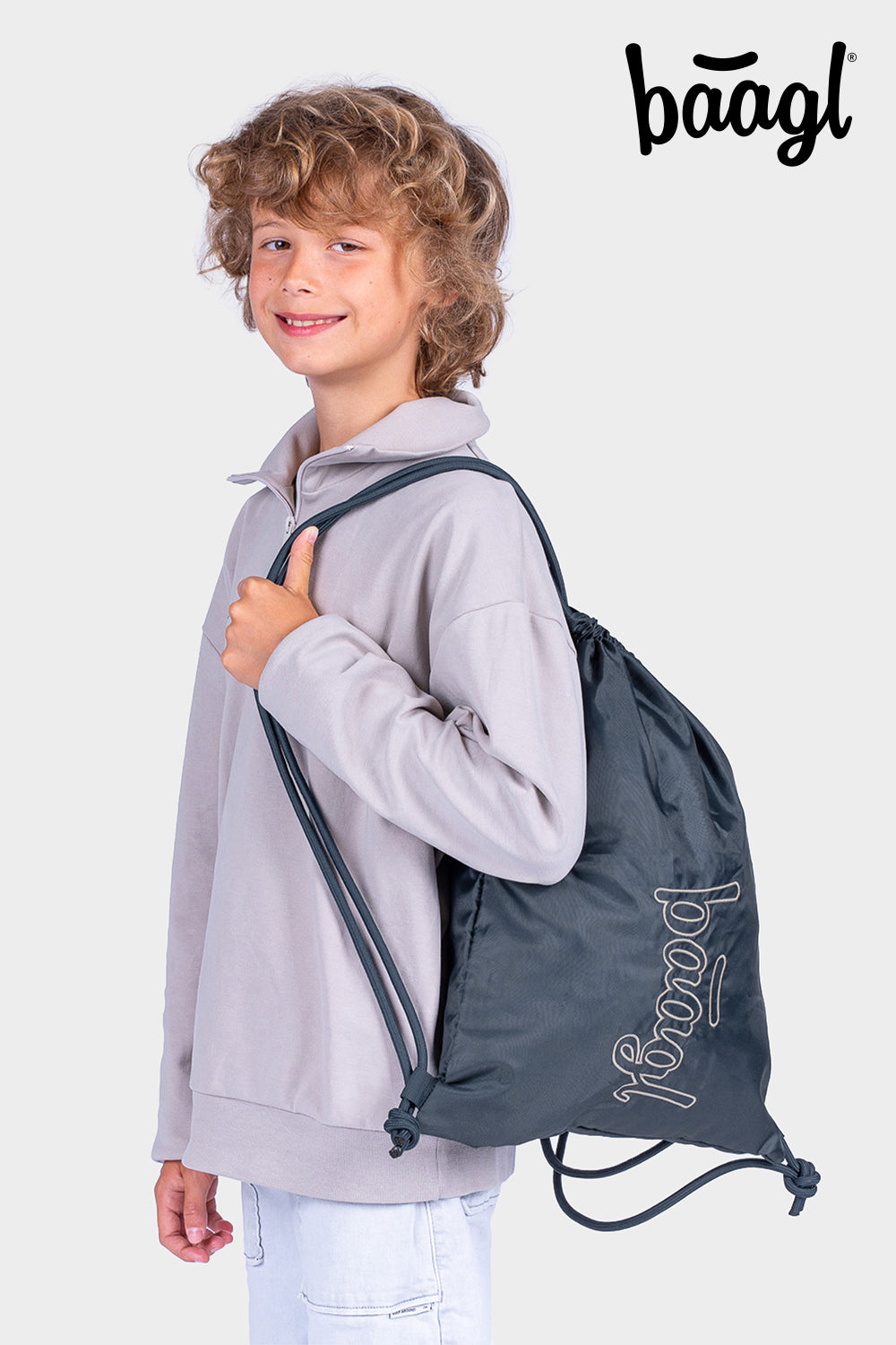 Multifunktionaler Turnbeutel mit stabilen Kordeln und auffälligem BAAGL-Logo. Hergestellt aus recyceltem, abwaschbarem Material und dadurch besonders praktisch.