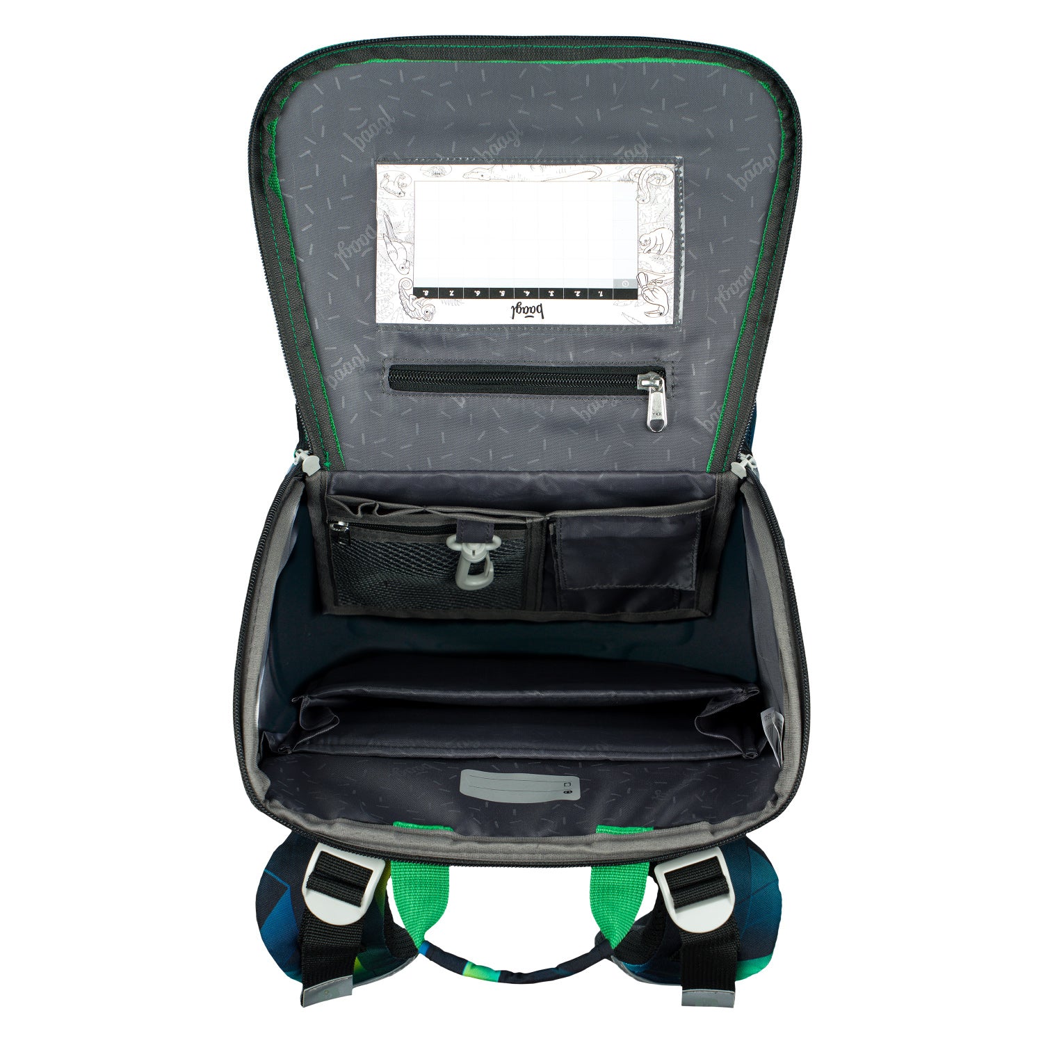 • Im Inneren des Ranzens befindet sich eine transparente Tasche für den Stundenplan und ein interner Organizer, der eine gleichmäßige Gewichtsverteilung ermöglicht, komplett mit einem elastischen Band zur Fixierung.